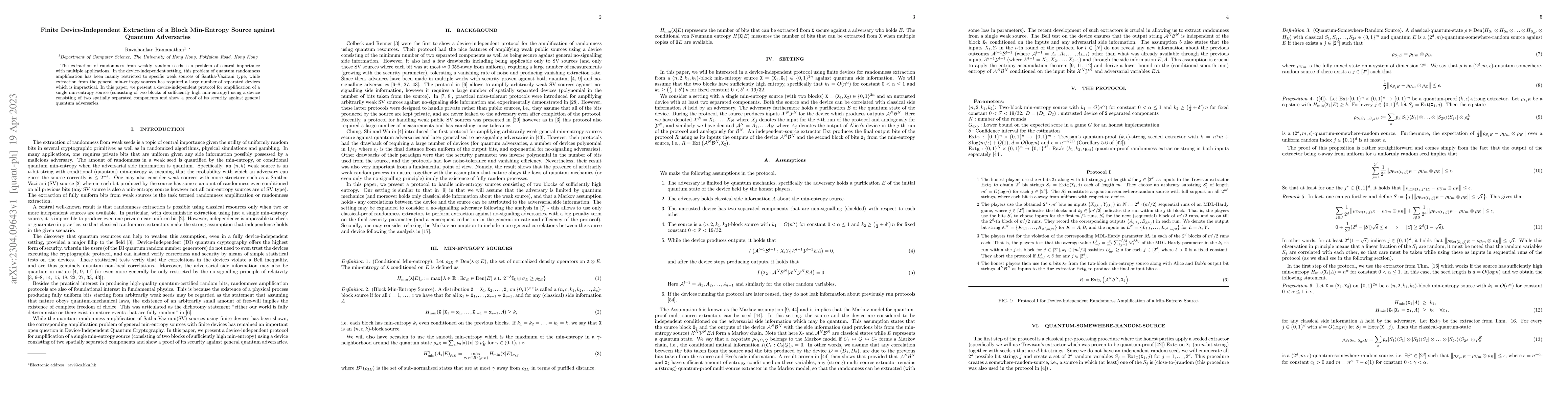 This paper proposes a device-independent protocol for amplifying randomness from a block min-entropy source using two spatially separated components, demonstrating its security against general quantum adversaries without requiring multiple devices.