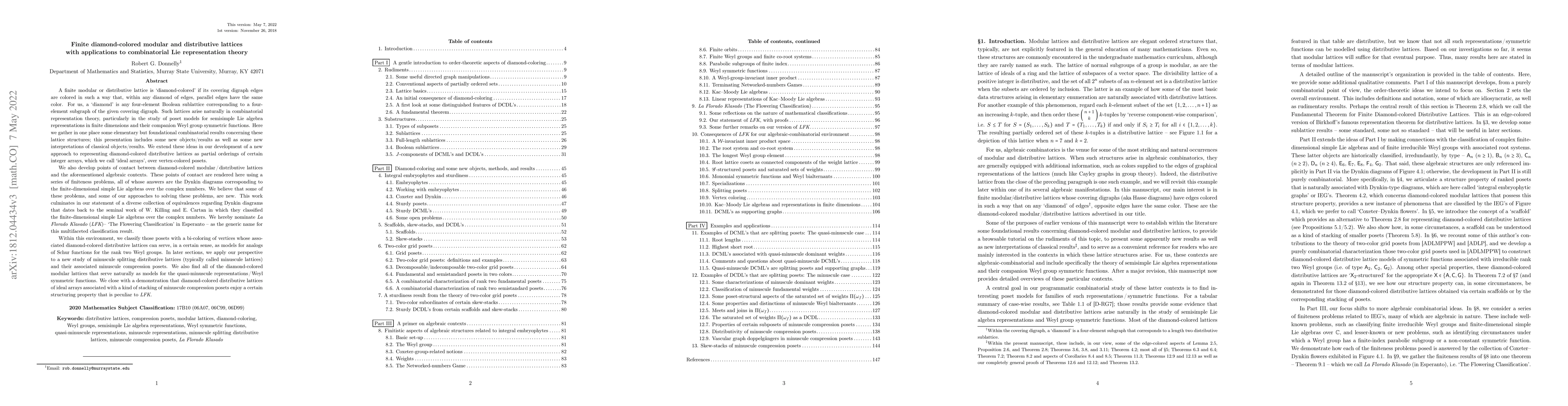 This paper explores finite diamond-colored modular and distributive lattices, linking their structures to combinatorial Lie representation theory, including new classifications and results on minuscule and quasi-minuscule representations. It gathers foundational results and reinterprets classical findings in the context of poset models for semisimple Lie algebras.