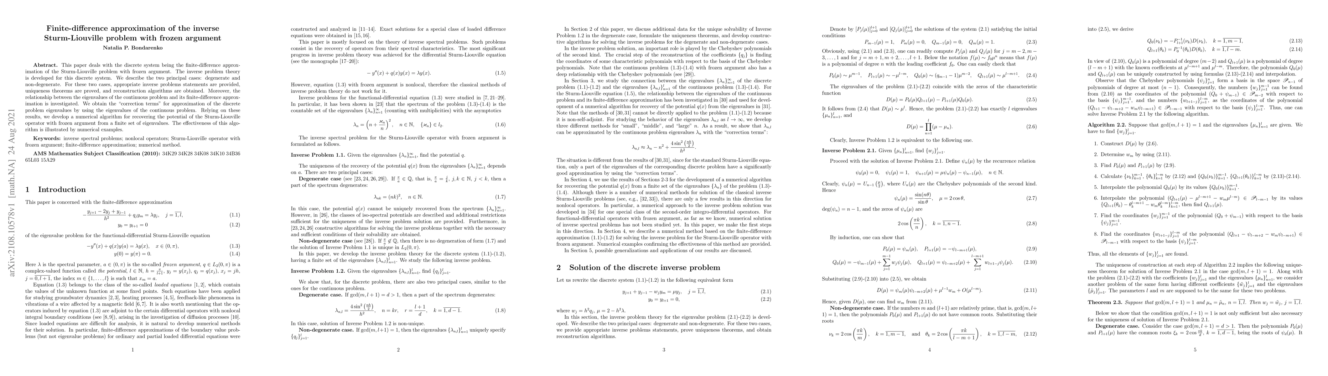 This paper develops a finite-difference approximation for the inverse Sturm-Liouville problem with a frozen argument, providing uniqueness theorems and reconstruction algorithms for both degenerate and non-degenerate cases. It also introduces a numerical algorithm for recovering the potential from a finite set of eigenvalues, validated through numerical examples.