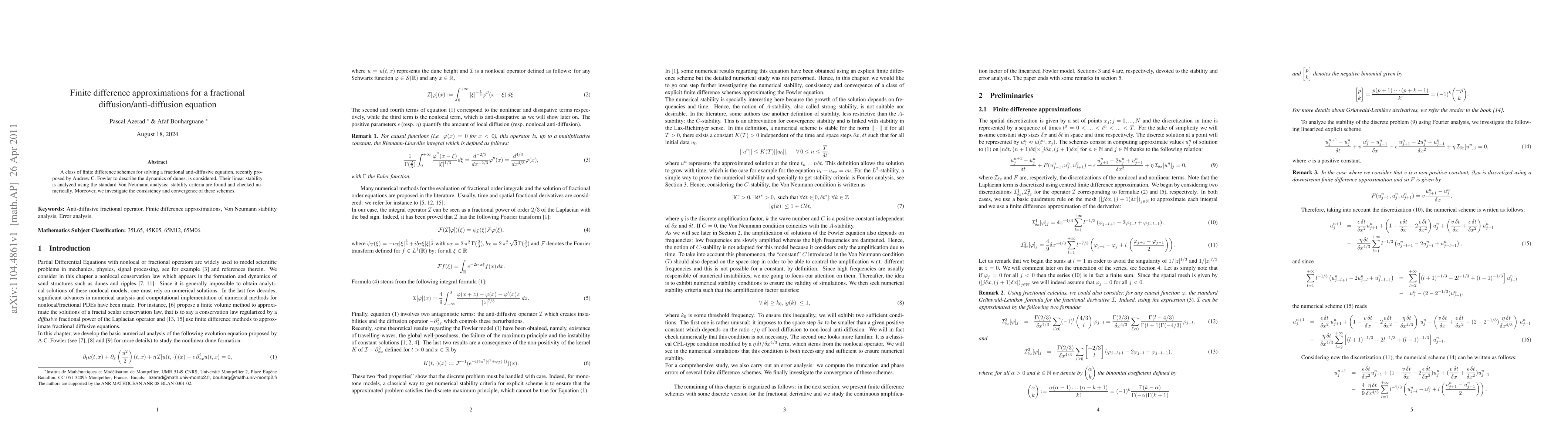 A class of finite difference schemes for solving a fractional anti-diffusive equation, recently proposed by Andrew C. Fowler to describe the dynamics of dunes, is considered. Their linear stability is analyzed using the standard Von Neumann analysis: stability criteria are found and checked numerically. Moreover, we investigate the consistency and convergence of these schemes.
