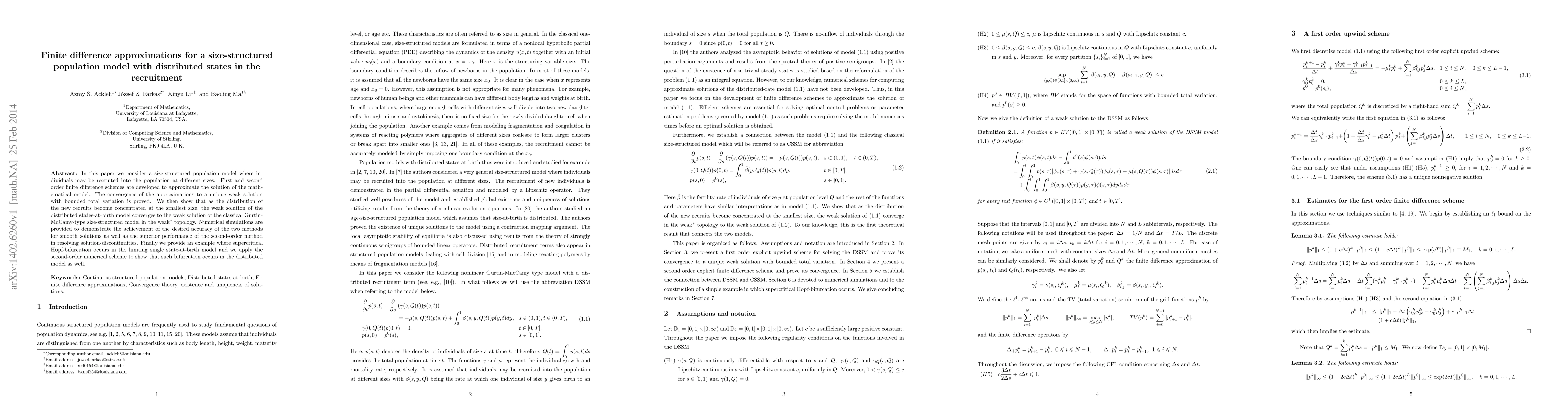 In this paper we consider a size-structured population model where individuals may be recruited into the population at different sizes. First and second order finite difference schemes are developed to approximate the solution of the mathematical model. The convergence of the approximations to a unique weak solution with bounded total variation is proved. We then show that as the distribution of the new recruits become concentrated at the smallest size, the weak solution of the distributed states-at-birth model converges to the weak solution of the classical Gurtin-McCamy-type size-structured model in the weak$^*$ topology. Numerical simulations are provided to demonstrate the achievement of the desired accuracy of the two methods for smooth solutions as well as the superior performance of the second-order method in resolving solution-discontinuities. Finally we provide an example where supercritical Hopf-bifurcation occurs in the limiting single state-at-birth model and we apply the second-order numerical scheme to show that such bifurcation occurs in the distributed model as well.