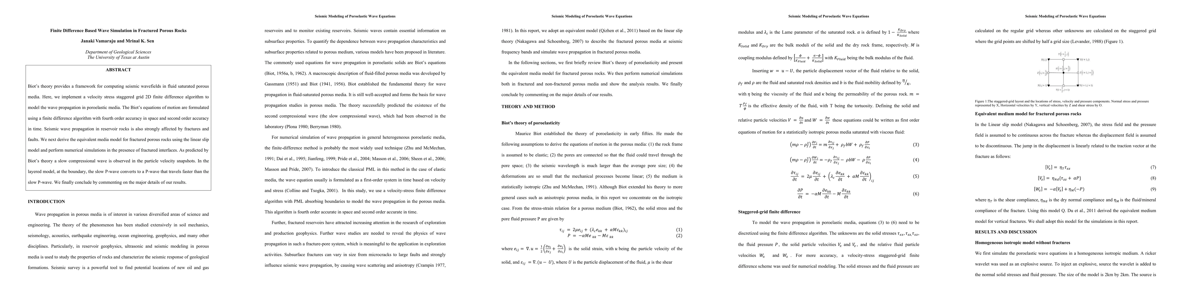 This research applies a high-accuracy finite difference algorithm to simulate seismic wave propagation in fractured porous rocks based on Biot's theory. It models wave behavior in poroelastic media and derives an equivalent media model for fractured rocks, revealing a slow compressional wave conversion at boundaries.
