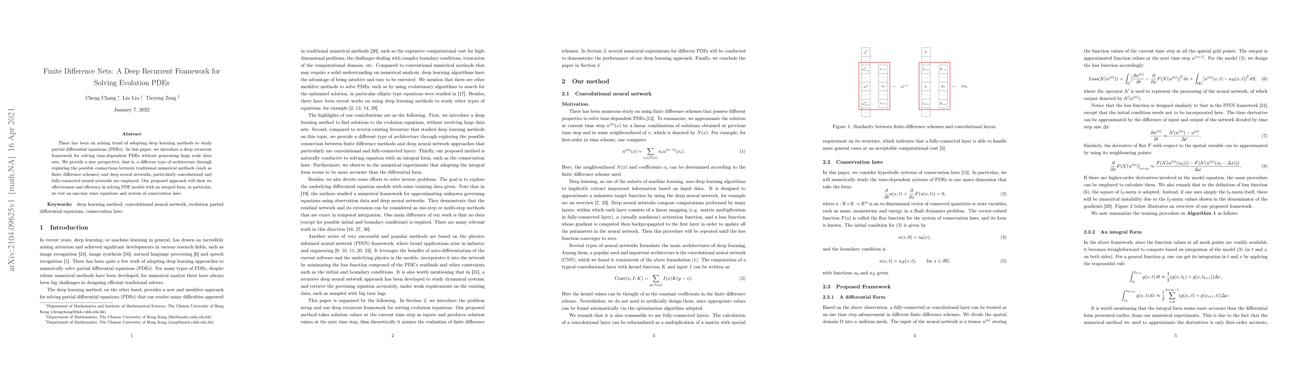 This paper proposes a deep recurrent framework called Finite Difference Nets for solving time-dependent PDEs, leveraging connections between traditional finite difference methods and deep neural networks. The approach demonstrates effectiveness and efficiency in solving PDE models, particularly tested on one-way wave equations and systems of conservation laws.