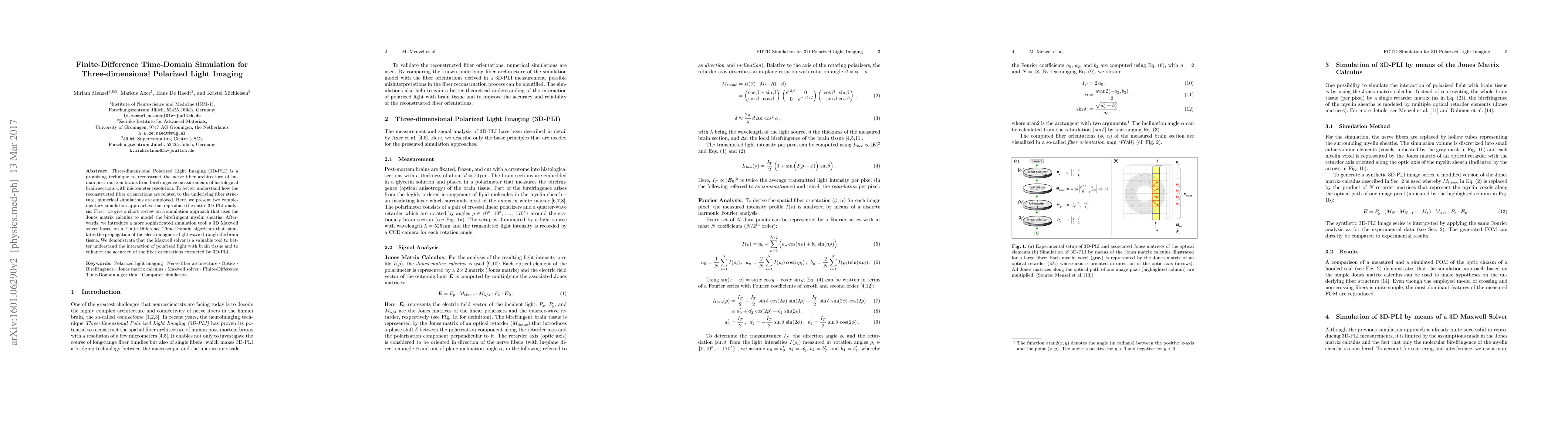 Three-dimensional Polarized Light Imaging (3D-PLI) is a promising technique to reconstruct the nerve fiber architecture of human post-mortem brains from birefringence measurements of histological brain sections with micrometer resolution. To better understand how the reconstructed fiber orientations are related to the underlying fiber structure, numerical simulations are employed. Here, we present two complementary simulation approaches that reproduce the entire 3D-PLI analysis: First, we give a short review on a simulation approach that uses the Jones matrix calculus to model the birefringent myelin sheaths. Afterwards, we introduce a more sophisticated simulation tool: a 3D Maxwell solver based on a Finite-Difference Time-Domain algorithm that simulates the propagation of the electromagnetic light wave through the brain tissue. We demonstrate that the Maxwell solver is a valuable tool to better understand the interaction of polarized light with brain tissue and to enhance the accuracy of the fiber orientations extracted by 3D-PLI.