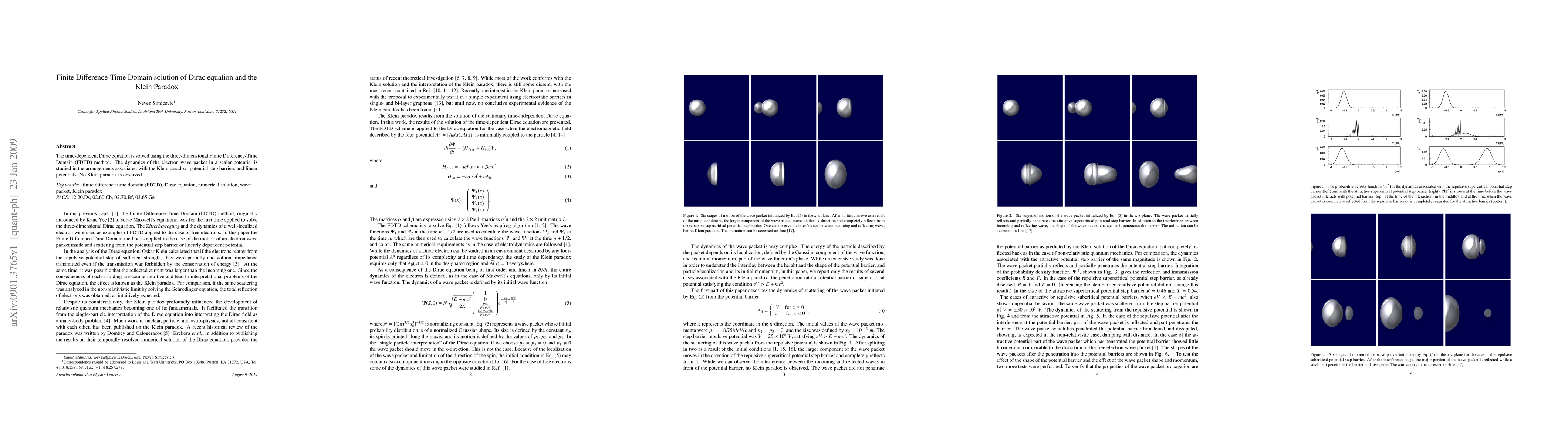 Summary: This paper employs the FDTD method to solve the time-dependent Dirac equation, examining electron wave packet dynamics in potential step barriers and linear potentials linked to the Klein paradox, but finds no evidence of the Klein paradox.