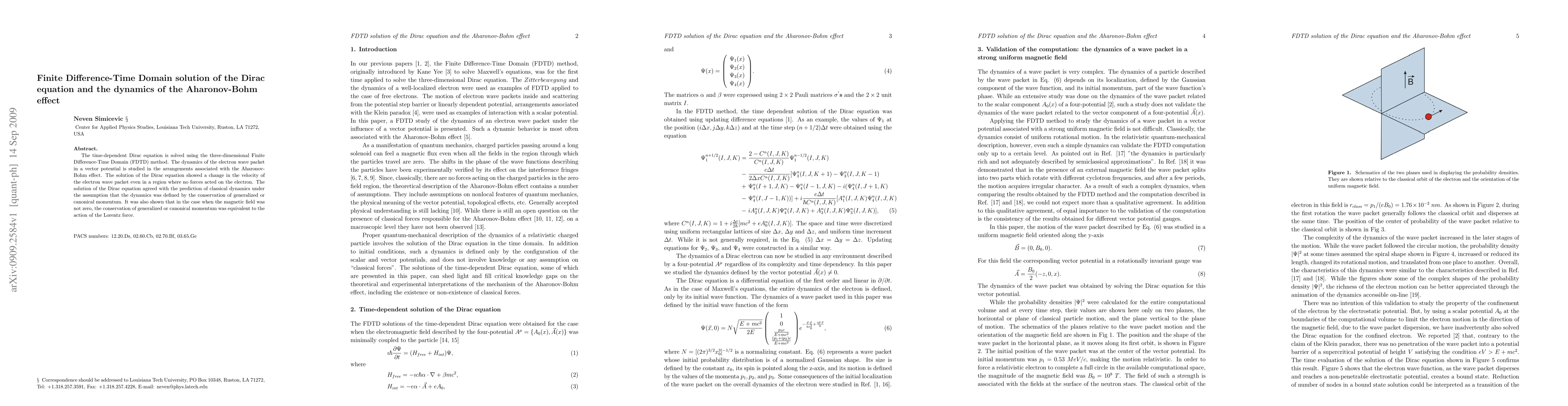 This paper uses the Finite Difference-Time Domain (FDTD) method to solve the time-dependent Dirac equation, exploring the dynamics of electron wave packets in vector potentials linked to the Aharonov-Bohm effect. The study reveals that the electron wave packet's velocity changes in regions without direct forces, aligning with classical dynamics based on momentum conservation.