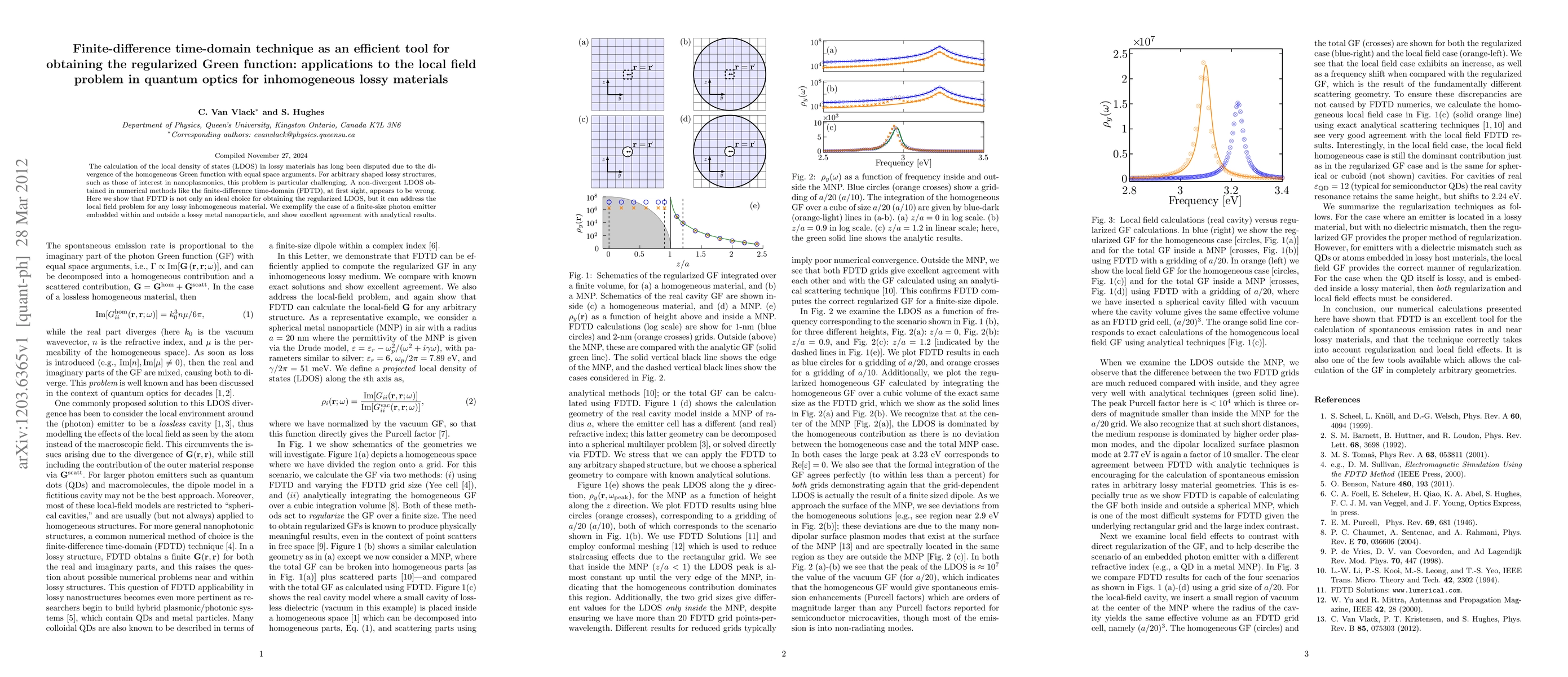 The calculation of the local density of states (LDOS) in lossy materials has long been disputed due to the divergence of the homogeneous Green function with equal space arguments. For arbitrary shaped lossy structures, such as those of interest in nanoplasmonics, this problem is particular challenging. A non-divergent LDOS obtained in numerical methods like the finite-difference time-domain (FDTD), at first sight, appears to be wrong. Here we show that FDTD is not only an ideal choice for obtaining the regularized LDOS, but it can address the local field problem for any lossy inhomogeneous material. We exemplify the case of a finite-size photon emitter embedded within and outside a lossy metal nanoparticle, and show excellent agreement with analytical results.