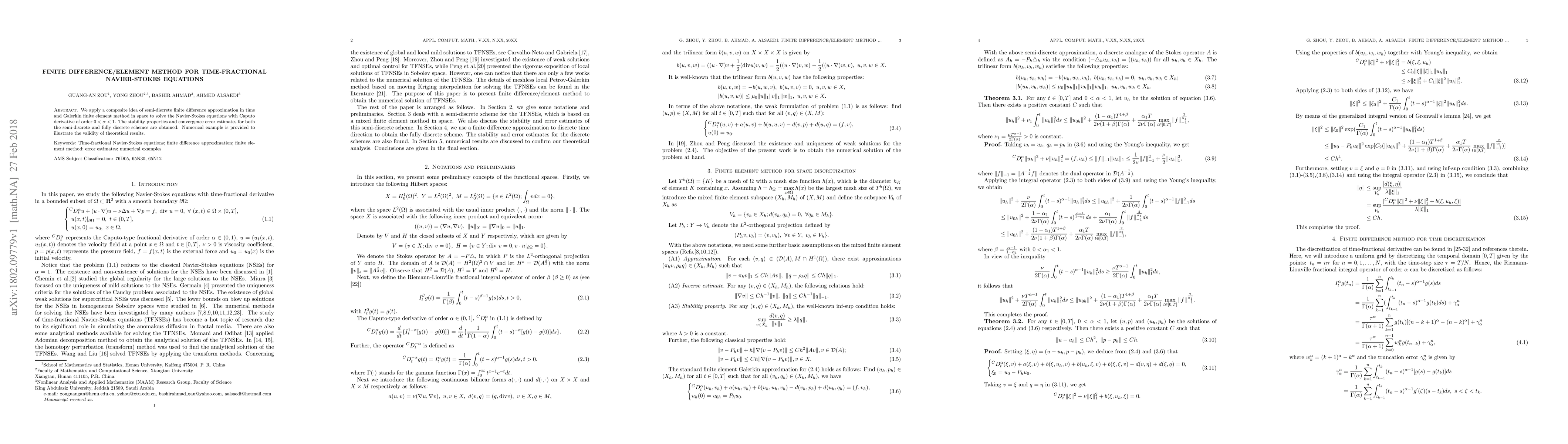 This paper combines semi-discrete finite difference and Galerkin finite element methods to solve time-fractional Navier-Stokes equations with Caputo derivatives. It provides stability and convergence analysis for both semi-discrete and fully discrete schemes, and a numerical example validates the theoretical results.