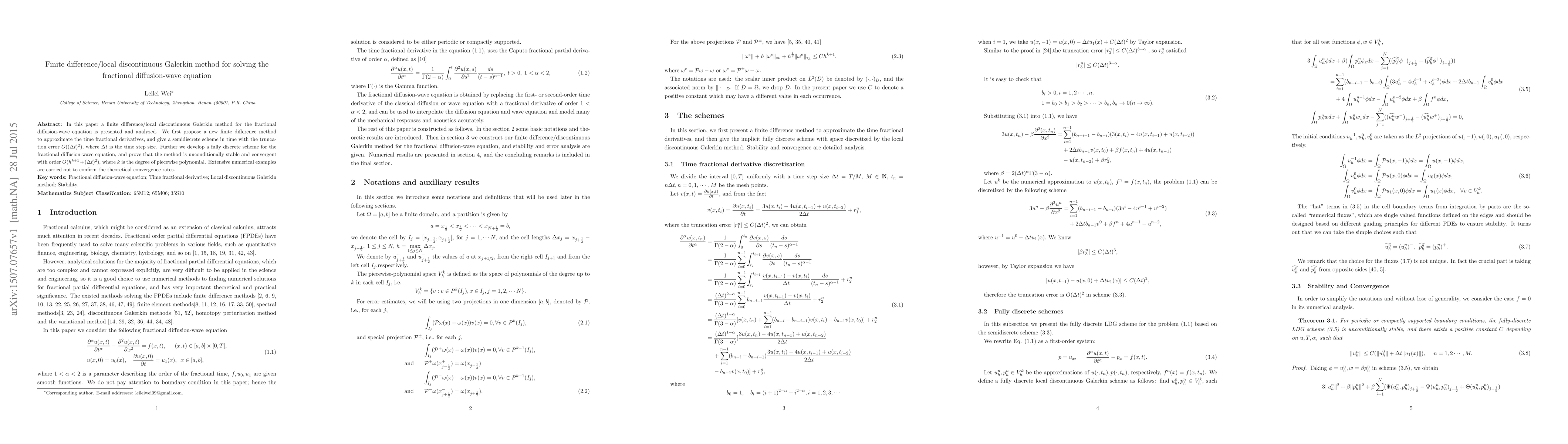 This paper proposes a finite difference/local discontinuous Galerkin method for solving the fractional diffusion-wave equation, demonstrating an unconditionally stable and convergent scheme with theoretical convergence order $O(h^{k+1}+(\Delta t)^{2})$. Numerical examples confirm the method's theoretical convergence rates.