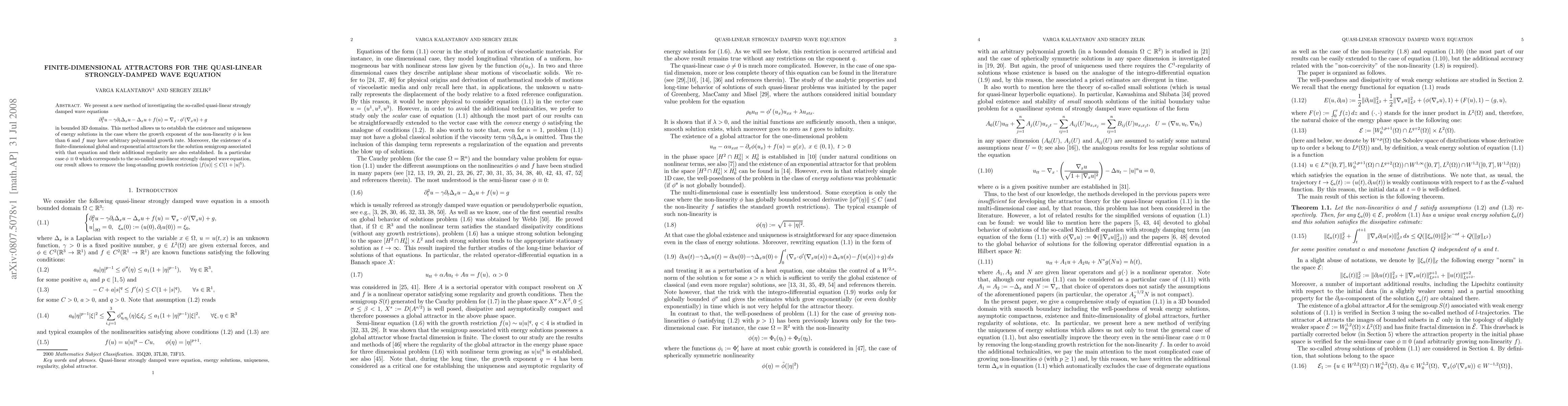 We present a new method of investigating the so-called quasi-linear strongly damped wave equations $$ \partial_t^2u-\gamma\partial_t\Delta_x u-\Delta_x u+f(u)= \nabla_x\cdot \phi'(\nabla_x u)+g $$ in bounded 3D domains. This method allows us to establish the existence and uniqueness of energy solutions in the case where the growth exponent of the non-linearity $\phi$ is less than 6 and $f$ may have arbitrary polynomial growth rate. Moreover, the existence of a finite-dimensional global and exponential attractors for the solution semigroup associated with that equation and their additional regularity are also established. In a particular case $\phi\equiv0$ which corresponds to the so-called semi-linear strongly damped wave equation, our result allows to remove the long-standing growth restriction $|f(u)|\leq C(1+ |u|^5)$.