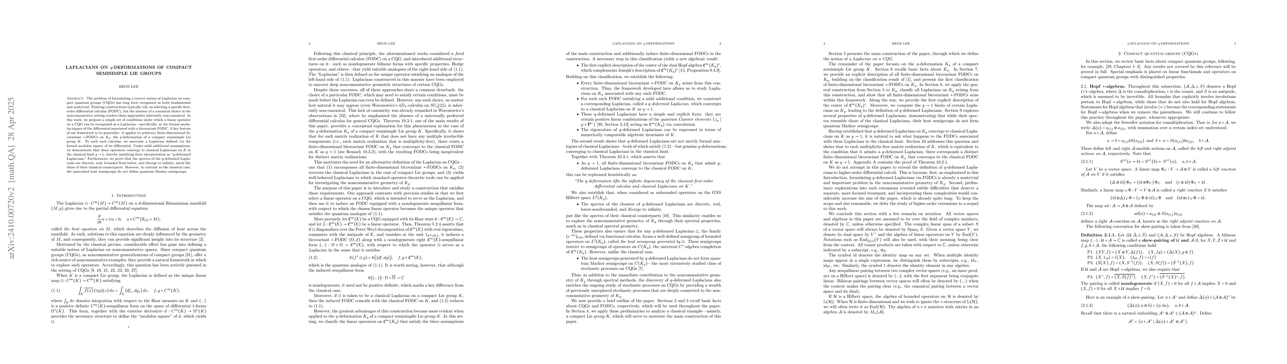 This research constructs a method to define Laplacians on $q$-deformations of compact semisimple Lie groups, showing that all finite-dimensional bicovariant first-order differential calculi on these groups are induced by linear operators. It reveals that these calculi converge to classical differential calculi as $q \rightarrow 1$, highlighting the relevance of non-Markovian stochastic processes for the geometry of $q$-deformed groups.