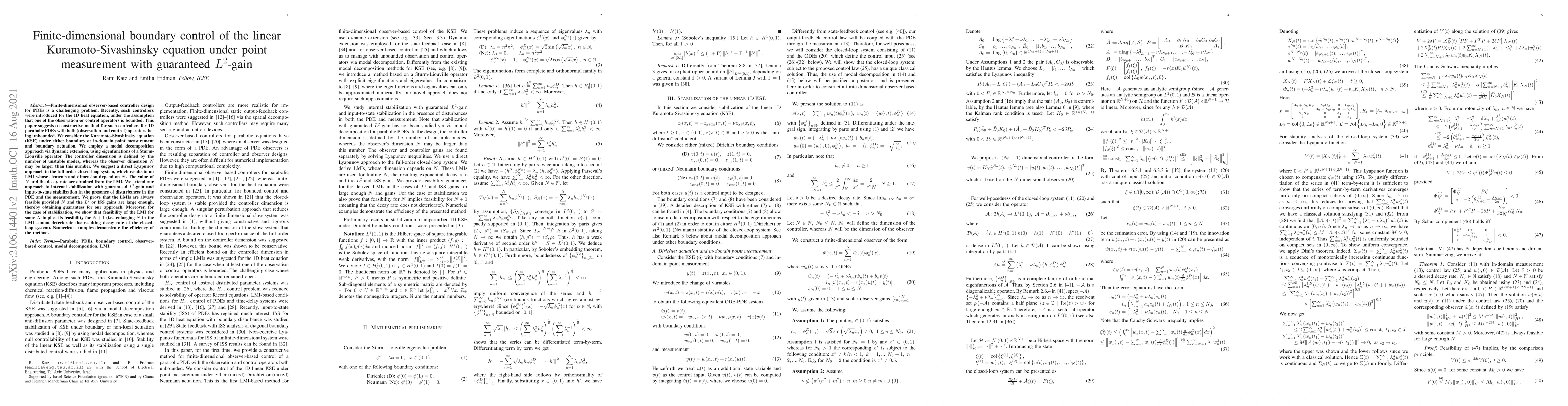 Finite-dimensional observer-based controller design for PDEs is a challenging problem. Recently, such controllers were introduced for the 1D heat equation, under the assumption that one of the observation or control operators is bounded. This paper suggests a constructive method for such controllers for 1D parabolic PDEs with both (observation and control) operators being unbounded. We consider the Kuramoto-Sivashinsky equation (KSE) under either boundary or in-domain point measurement and boundary actuation. We employ a modal decomposition approach via dynamic extension, using eigenfunctions of a Sturm-Liouville operator. The controller dimension is defined by the number of unstable modes, whereas the observer dimension $N$ may be larger than this number. We suggest a direct Lyapunov approach to the full-order closed-loop system, which results in an LMI whose elements and dimension depend on $N$. The value of $N$ and the decay rate are obtained from the LMI. We extend our approach to internal stabilization with guaranteed $L^2$-gain and input-to-state stabilization. We prove two crucial properties of the derived LMIs. First, We prove that the LMIs are always feasible provided $N$ and the $L^2$ or ISS gains are large enough, thereby obtaining guarantees for our approach. Moreover, for the case of stabilization, we show that feasibility of the LMI for some $N$ implies its feasibility for $N+1$ (i.e., enlarging $N$ in the LMI cannot deteriorate the resulting decay rate of the closed-loop system). Numerical examples demonstrate the efficiency of the method.