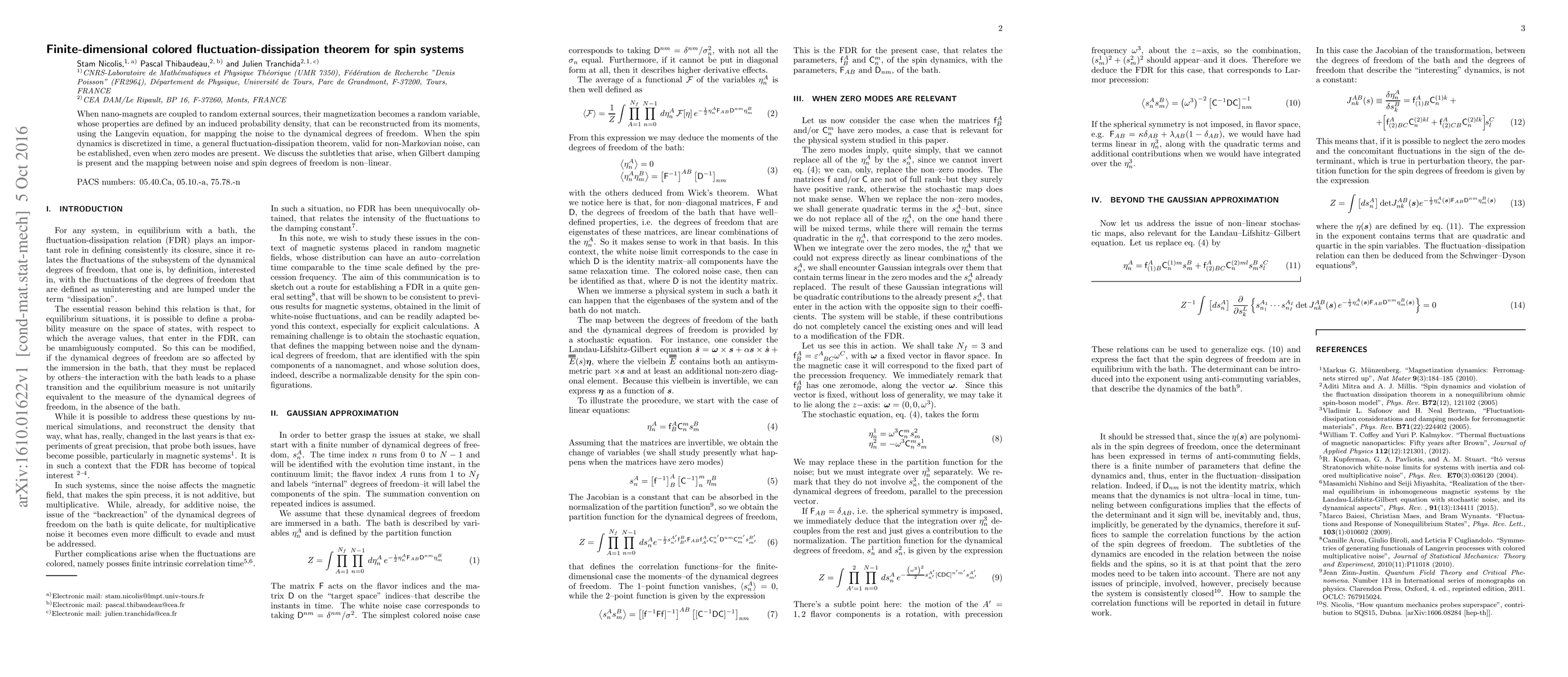 When nano-magnets are coupled to random external sources, their magnetization becomes a random variable, whose properties are defined by an induced probability density, that can be reconstructed from its moments, using the Langevin equation, for mapping the noise to the dynamical degrees of freedom. When the spin dynamics is discretized in time, a general fluctuation-dissipation theorem, valid for non-Markovian noise, can be established, even when zero modes are present. We discuss the subtleties that arise, when Gilbert damping is present and the mapping between noise and spin degrees of freedom is non--linear.