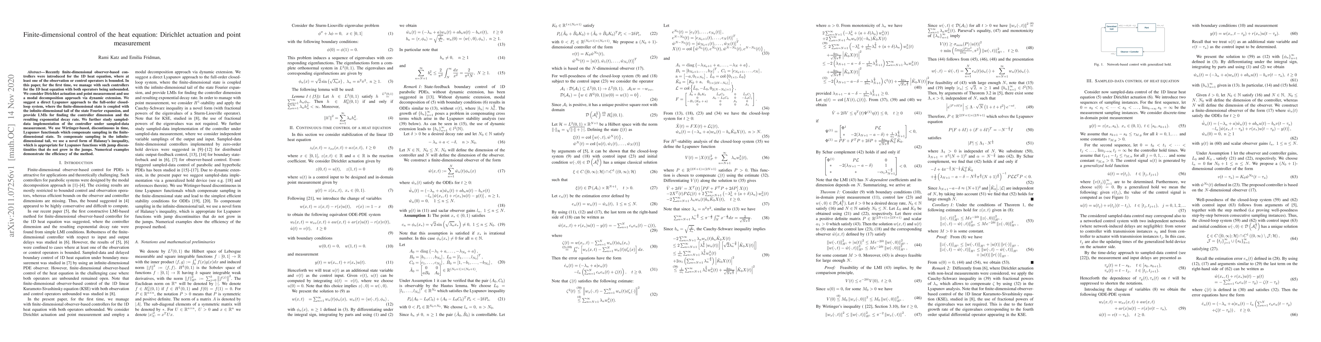 Recently finite-dimensional observer-based controllers were introduced for the 1D heat equation, where at least one of the observation or control operators is bounded. In this paper, for the first time, we manage with such controllers for the 1D heat equation with both operators being unbounded. We consider Dirichlet actuation and point measurement and use a modal decomposition approach via dynamic extension. We suggest a direct Lyapunov approach to the full-order closed-loop system, where the finite-dimensional state is coupled with the infinite-dimensional tail of the state Fourier expansion, and provide LMIs for finding the controller dimension and the resulting exponential decay rate. We further study sampled-data implementation of the controller under sampled-data measurement. We use Wirtinger-based, discontinuous in time, Lyapunov functionals which compensate sampling in the finite-dimensional state. To compensate sampling in the infinite-dimensional tail, we use a novel form of Halanay's inequality, which is appropriate for Lyapunov functions with jump discontinuities that do not grow in the jumps. Numerical examples demonstrate the efficiency of the method.