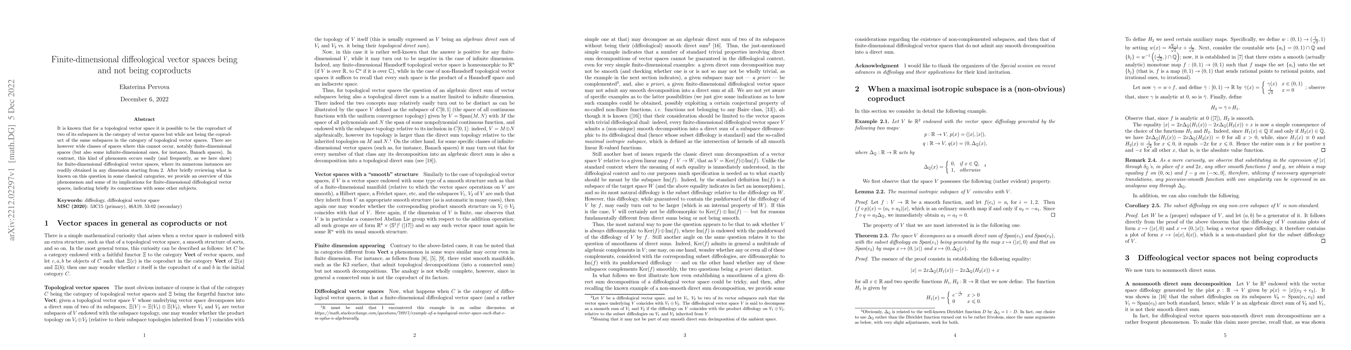 We discuss the question when a finite-dimensional diffeological vector space is, or turns out not to be, the coproduct of its subspaces in the category of diffeological vector spaces, after reviewing the same question in some other categories, where however it is limited to infinite dimension.