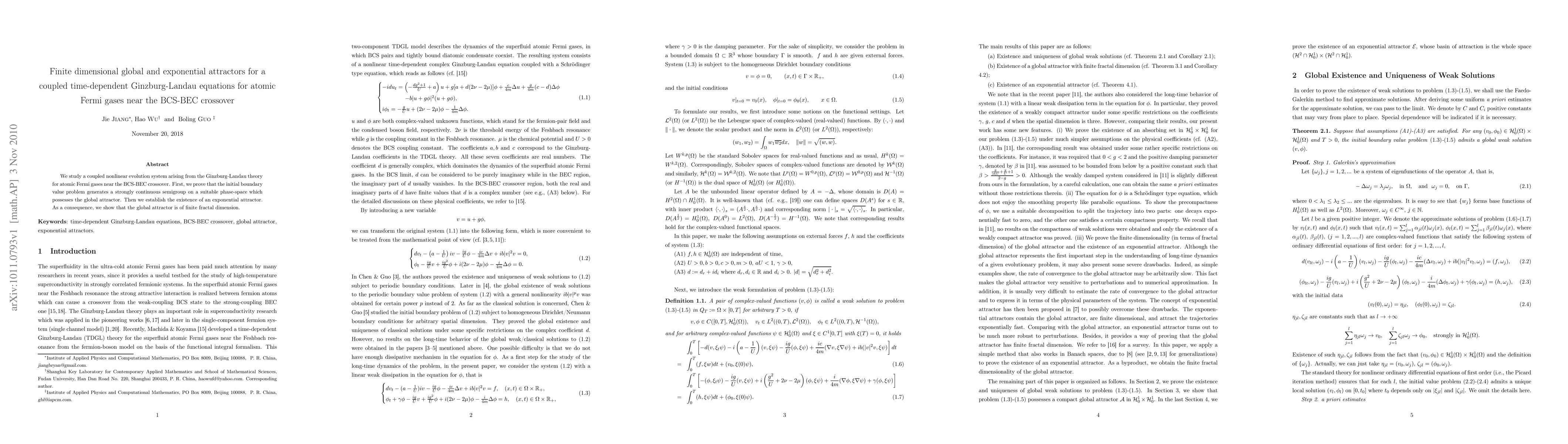 This paper investigates a coupled nonlinear evolution system from Ginzburg-Landau theory for Fermi gases near the BCS-BEC crossover, proving the existence of a global attractor and an exponential attractor, and demonstrating that the global attractor has finite fractal dimension.