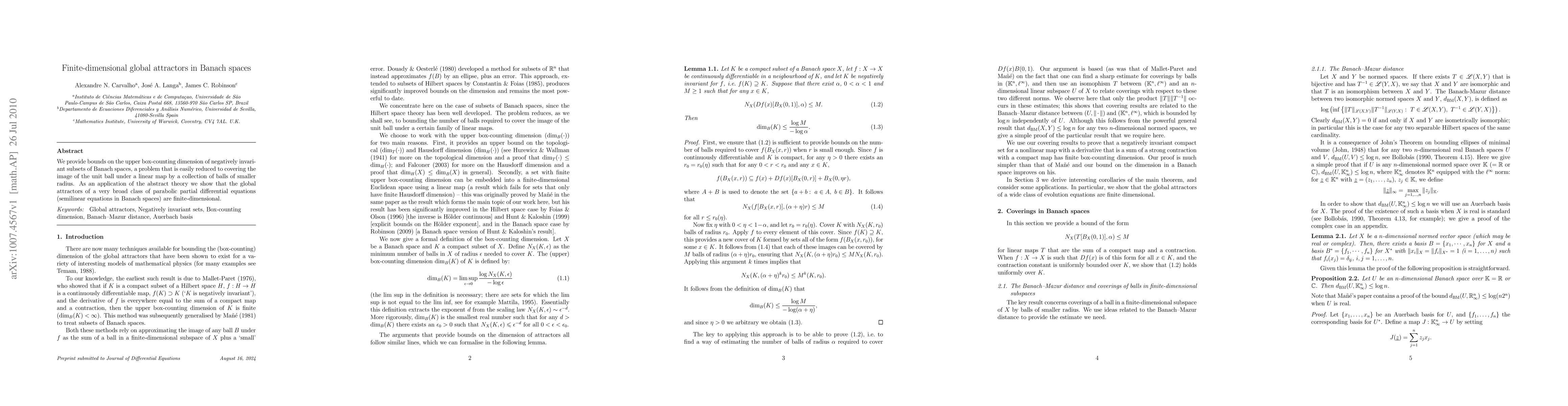This paper establishes bounds on the upper box-counting dimension of negatively invariant subsets in Banach spaces, demonstrating that the global attractors of a wide range of parabolic partial differential equations are finite-dimensional. The methodology involves reducing the problem to covering the unit ball's image under a linear map with smaller balls.