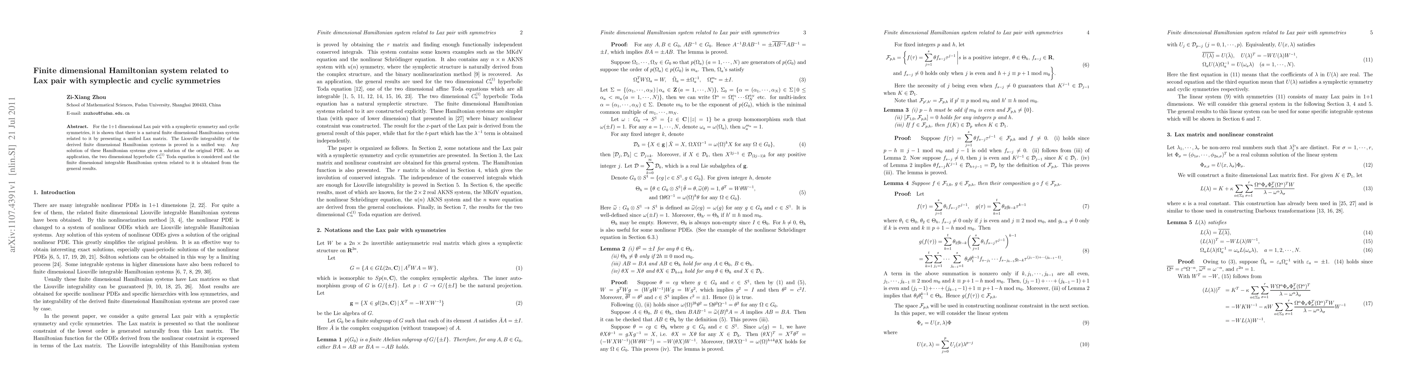 This paper establishes a finite dimensional Hamiltonian system linked to a 1+1 dimensional Lax pair featuring symplectic and cyclic symmetries, proving its Liouville integrability and demonstrating that solutions of the Hamiltonian system correspond to solutions of the original PDE. An application to the two-dimensional hyperbolic $C_n^{(1)}$ Toda equation is also presented.