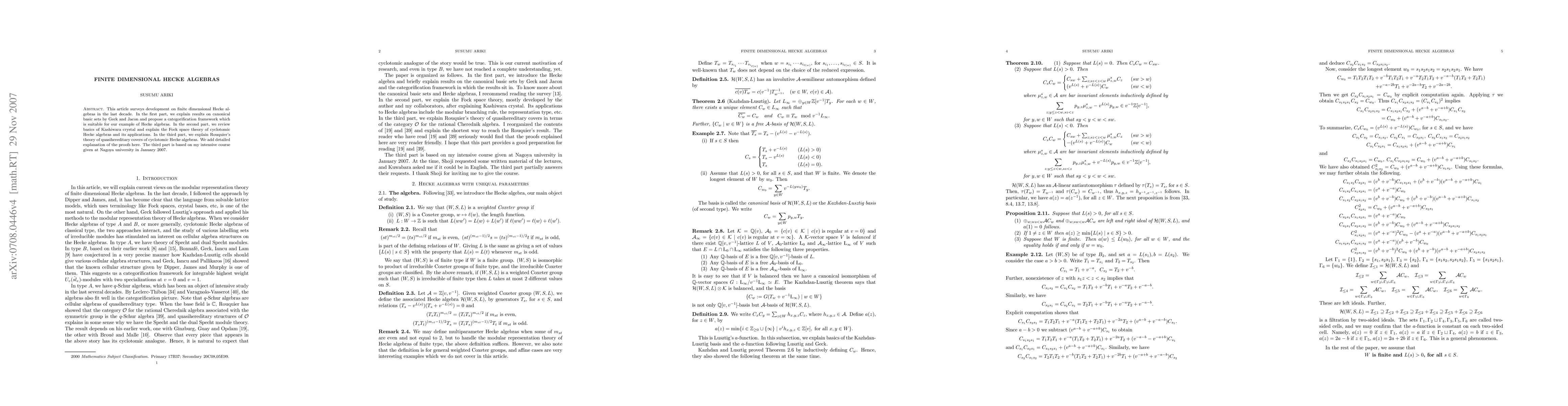 These are notes prepared for ICRA workshop at Torun, Poland, August 2007. In the first part, we explain results on canonical basic sets by Geck and Jacon and propose a categorification framework which is suitable for our example of Hecke algebras. In the second part, we review basics of Kashiwara crystal and explain the Fock space theory of cyclotomic Hecke algebras and its applications. In the third part, we explain Rouquier's theory of quasihereditary covers of cyclotomic Hecke algebras. We add detailed explanation of the proofs here. The third part is based on my intensive course given at Nagoya university in January 2007.