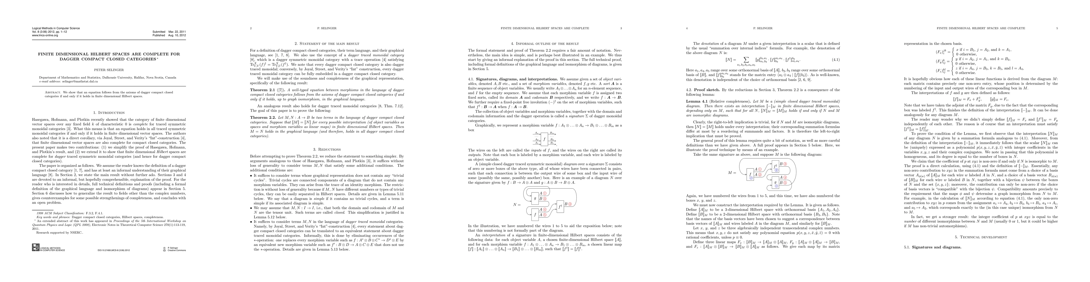 Summary: This paper proves that equations in dagger compact closed categories are equivalent to their validity in finite dimensional Hilbert spaces, establishing completeness for such categories.