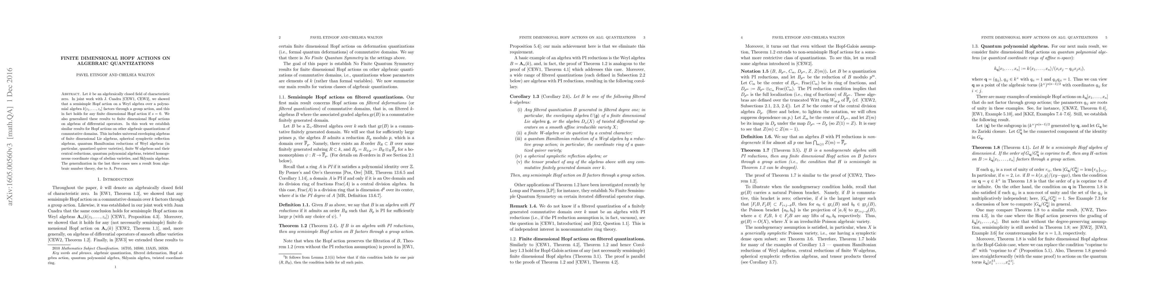 This paper generalizes results on finite dimensional Hopf actions, showing that such actions on various algebraic quantizations, including universal enveloping algebras and Sklyanin algebras, factor through group actions, leveraging techniques from algebraic number theory.