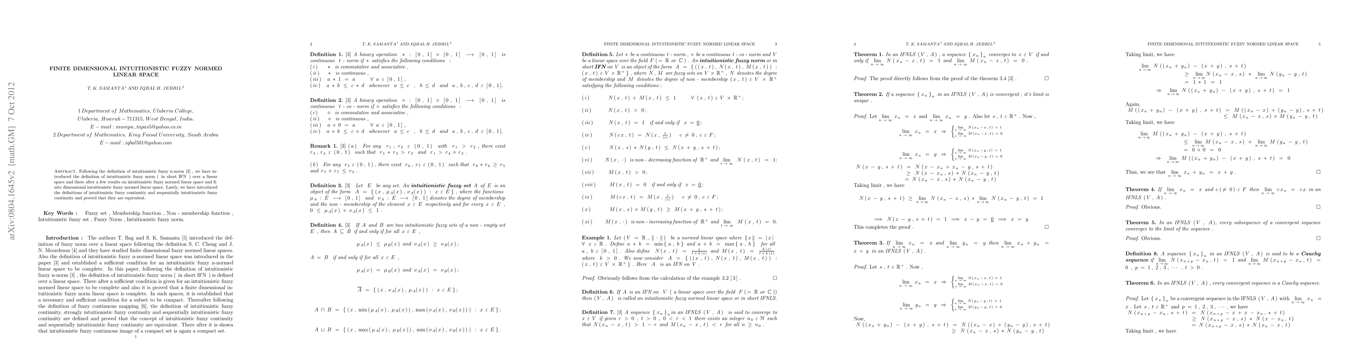 Summary: This paper defines intuitionistic fuzzy norms over linear spaces and explores properties of finite-dimensional intuitionistic fuzzy normed linear spaces, introducing concepts of intuitionistic fuzzy continuity and sequentially intuitionistic fuzzy continuity, proving their equivalence.