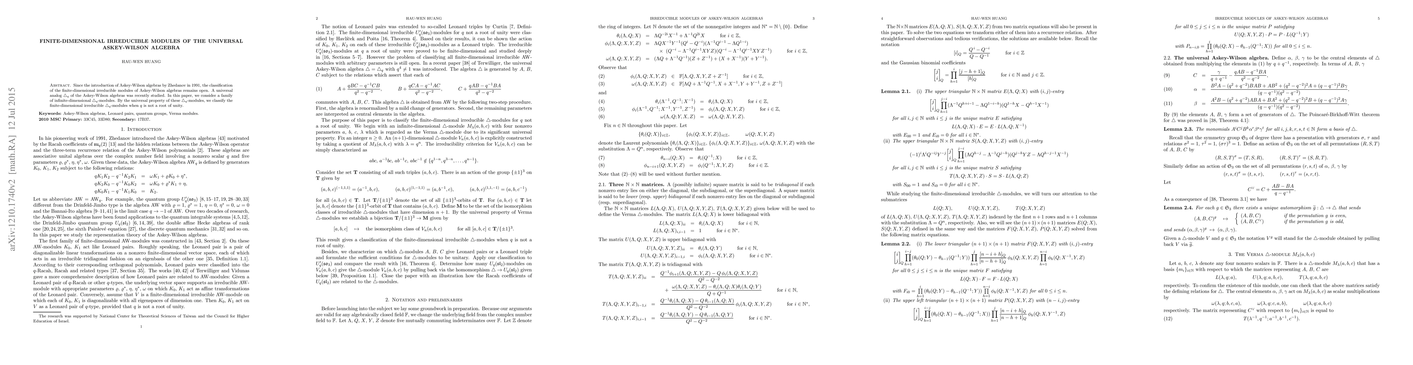 This paper classifies the finite-dimensional irreducible modules of the universal Askey-Wilson algebra $\triangle_q$ when $q$ is not a root of unity, addressing a longstanding open problem in the field. The classification is achieved through the study of a family of infinite-dimensional $\triangle_q$-modules.
