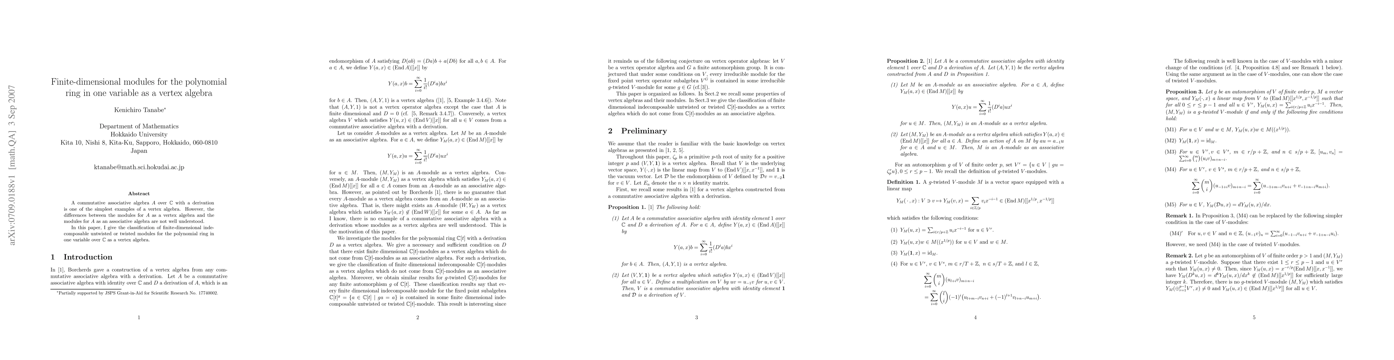 A commutative associative algebra $A$ over ${\mathbb C}$ with a derivation is one of the simplest examples of a vertex algebra. However, the differences between the modules for $A$ as a vertex algebra and the modules for $A$ as an associative algebra are not well understood. In this paper, I give the classification of finite-dimensional indecomposable untwisted or twisted modules for the polynomial ring in one variable over ${\mathbb C}$ as a vertex algebra.