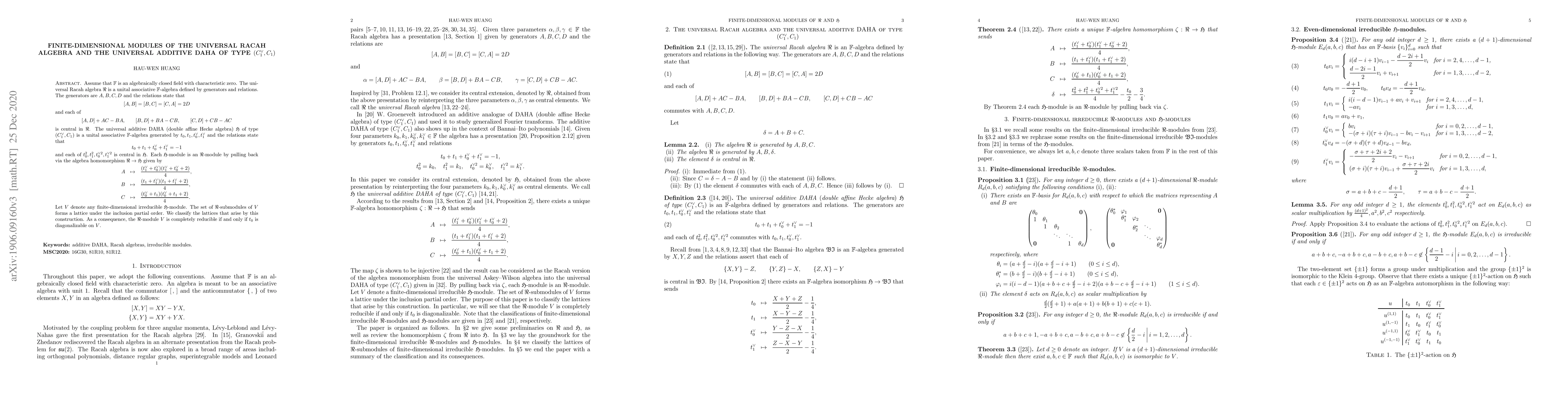 This paper studies the finite-dimensional modules of the universal Racah algebra $\Re$ and the universal additive DAHA $\mathfrak H$ of type $(C_1^\vee,C_1)$. It classifies the lattices of $\Re$-submodules of finite-dimensional irreducible $\mathfrak H$-modules and shows that $\Re$-module $V$ is completely reducible if $t_0$ is diagonalizable on $V$.