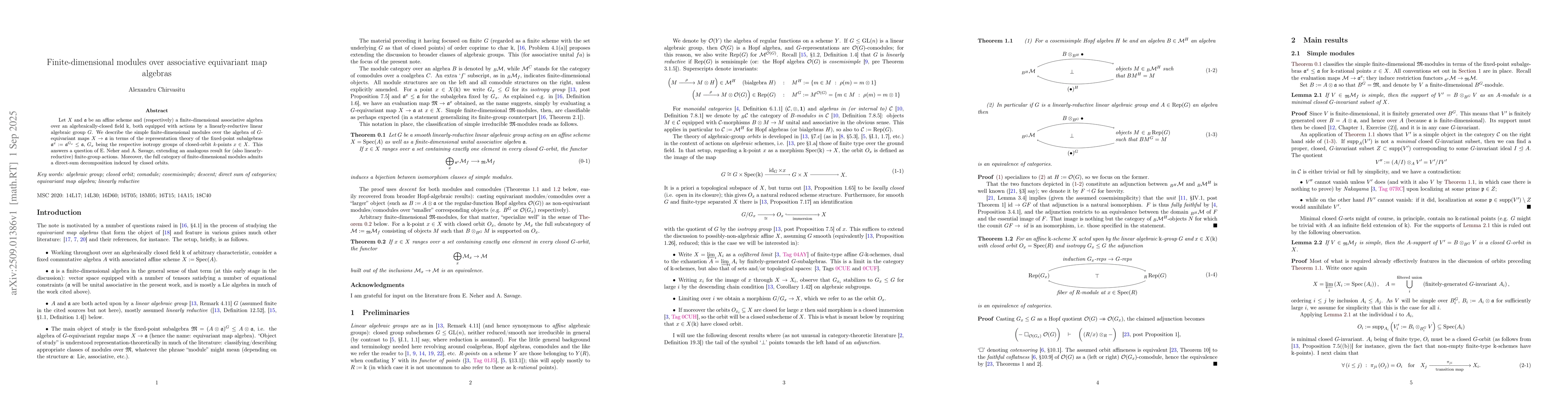 Let $X$ and $\mathfrak{a}$ be an affine scheme and (respectively) a finite-dimensional associative algebra over an algebraically-closed field $\Bbbk$, both equipped with actions by a linearly-reductive linear algebraic group $G$. We describe the simple finite-dimensional modules over the algebra of $G$-equivariant maps $X\to \mathfrak{a}$ in terms of the representation theory of the fixed-point subalgebras $\mathfrak{a}^x:=\mathfrak{a}^{G_x}\le \mathfrak{a}$, $G_x$ being the respective isotropy groups of closed-orbit $k$-points $x\in X$. This answers a question of E. Neher and A. Savage, extending an analogous result for (also linearly-reductive) finite-group actions. Moreover, the full category of finite-dimensional modules admits a direct-sum decomposition indexed by closed orbits.
