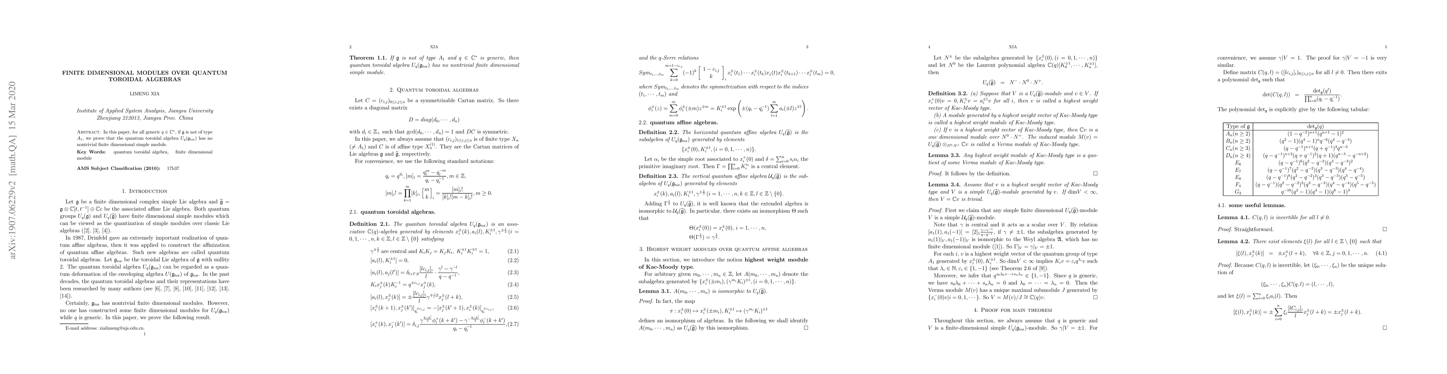 The representations of the quantum toroidal algebras have been widely studied by many authors. However, no one has constructed some finite dimensional modules for them while $q$ is generic. In this paper, for all $\mathfrak{g}$-generic $q$, if $\mathfrak{g}$ is not of type $A_1$, we prove that the quantum toroidal algebra $U_q(\mathfrak{g}_{\rm tor})$ has no nontrivial finite dimensional simple module.