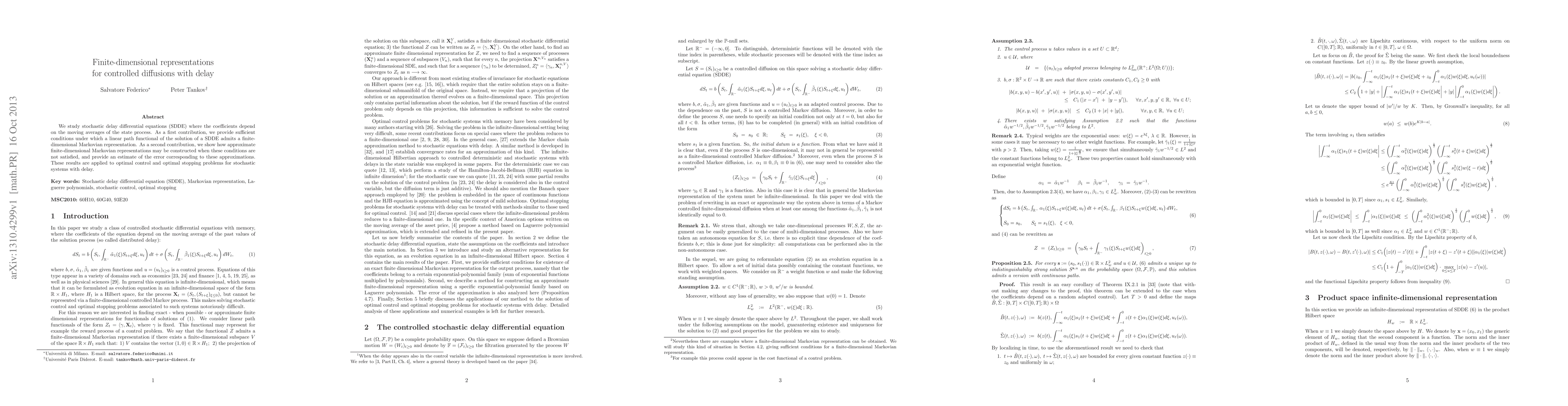 We study stochastic delay differential equations (SDDE) where the coefficients depend on the moving averages of the state process. As a first contribution, we provide sufficient conditions under which a linear path functional of the solution of a SDDE admits a finite-dimensional Markovian representation. As a second contribution, we show how approximate finite-dimensional Markovian representations may be constructed when these conditions are not satisfied, and provide an estimate of the error corresponding to these approximations. These results are applied to optimal control and optimal stopping problems for stochastic systems with delay.
