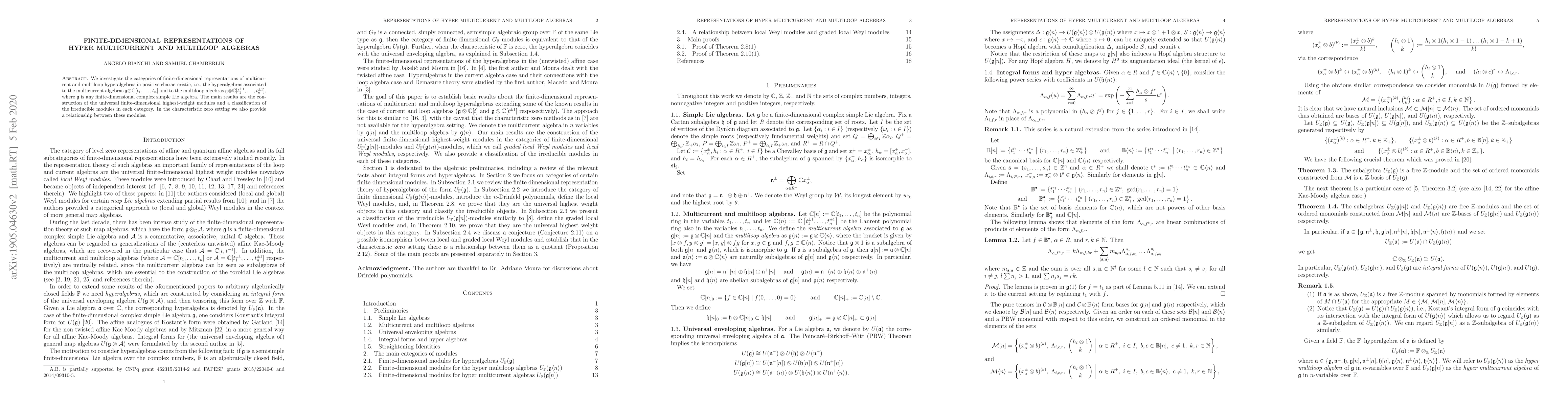 Researchers investigate finite-dimensional representations of hyperalgebras associated with multicurrent and multiloop algebras, finding universal modules and classifying irreducible modules in these categories.