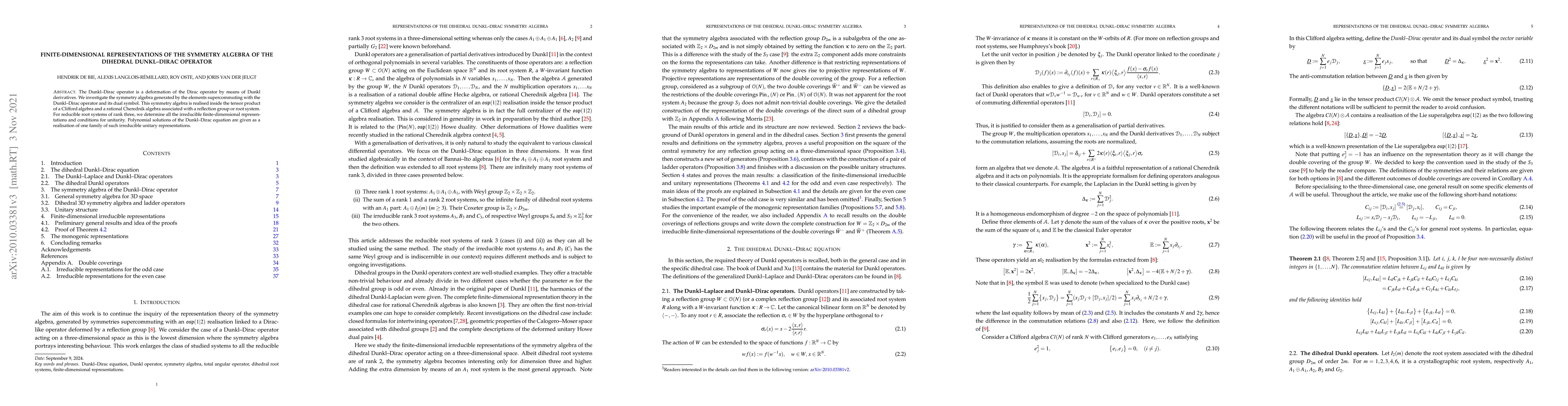 This paper explores the symmetry algebra of the dihedral Dunkl--Dirac operator, identifying its finite-dimensional representations within a tensor product of a Clifford algebra and a rational Cherednik algebra. For rank three reducible root systems, it determines all irreducible representations and conditions for unitarity, with polynomial solutions of the Dunkl--Dirac equation serving as a realization of one family of these unitary representations.