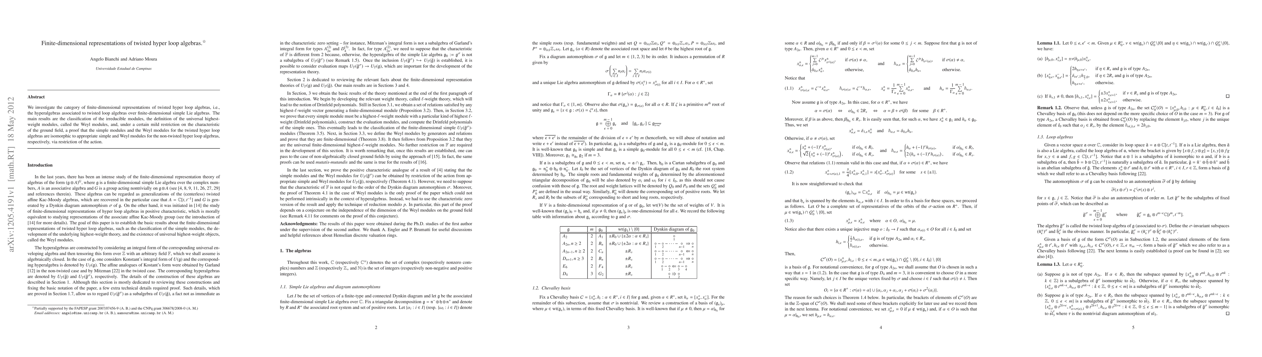 This paper classifies finite-dimensional irreducible representations of twisted hyper loop algebras, defines universal highest-weight modules (Weyl modules), and proves isomorphism between simple modules of twisted and non-twisted hyper loop algebras under certain characteristic restrictions.