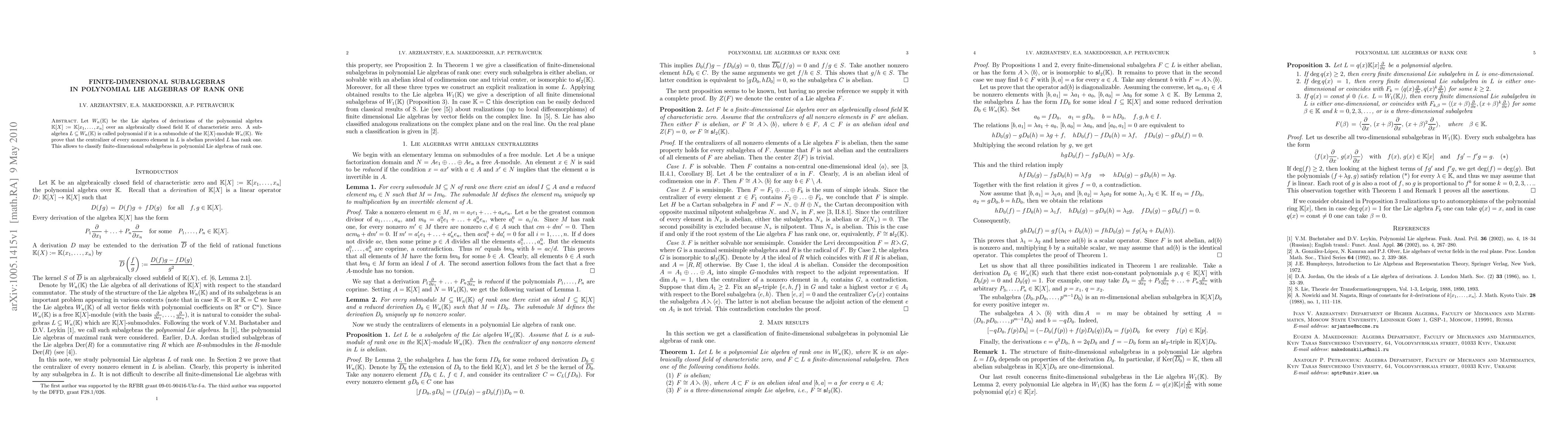 This paper proves that the centralizer of any nonzero element in a rank one polynomial subalgebra of the Lie algebra of derivations of the polynomial algebra over an algebraically closed field is abelian, enabling the classification of finite-dimensional subalgebras in such polynomial Lie algebras.