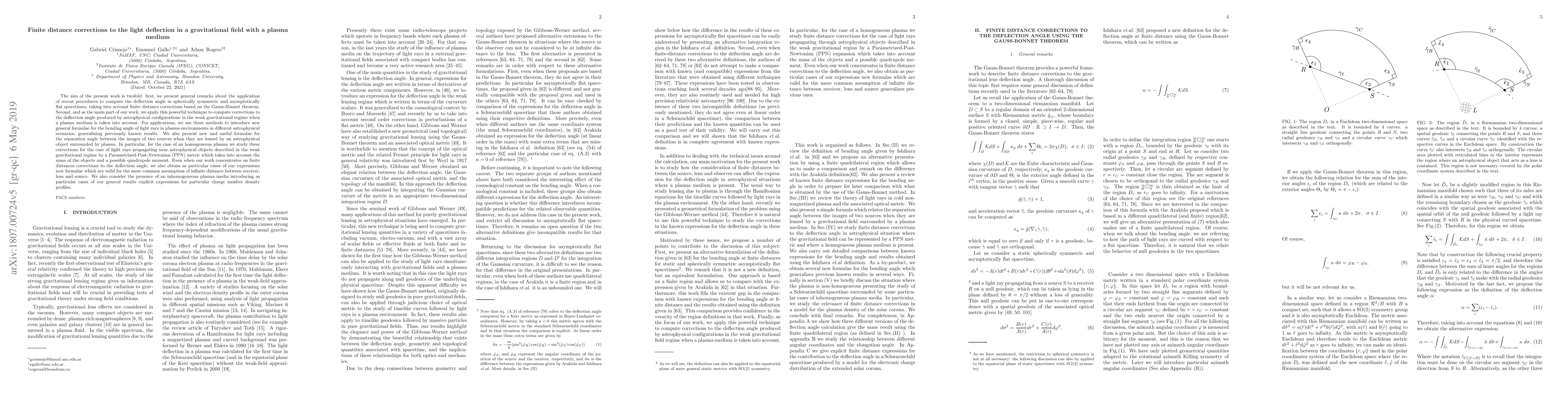 This paper develops methods to compute finite distance corrections to the light deflection angle in gravitational fields with a plasma medium, applying the Gauss-Bonnet theorem. It introduces new general formulae for light bending and image separation in plasma environments, extending previous results for both homogeneous and inhomogeneous plasmas.