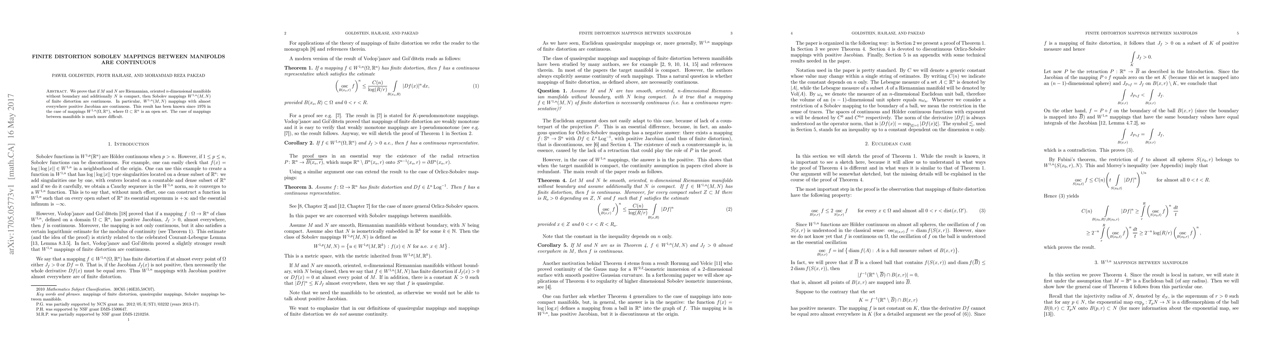 This paper proves that Sobolev mappings of finite distortion between compact Riemannian manifolds are continuous, extending a known result from Euclidean spaces to general manifolds. The continuity holds for mappings with almost everywhere positive Jacobian.