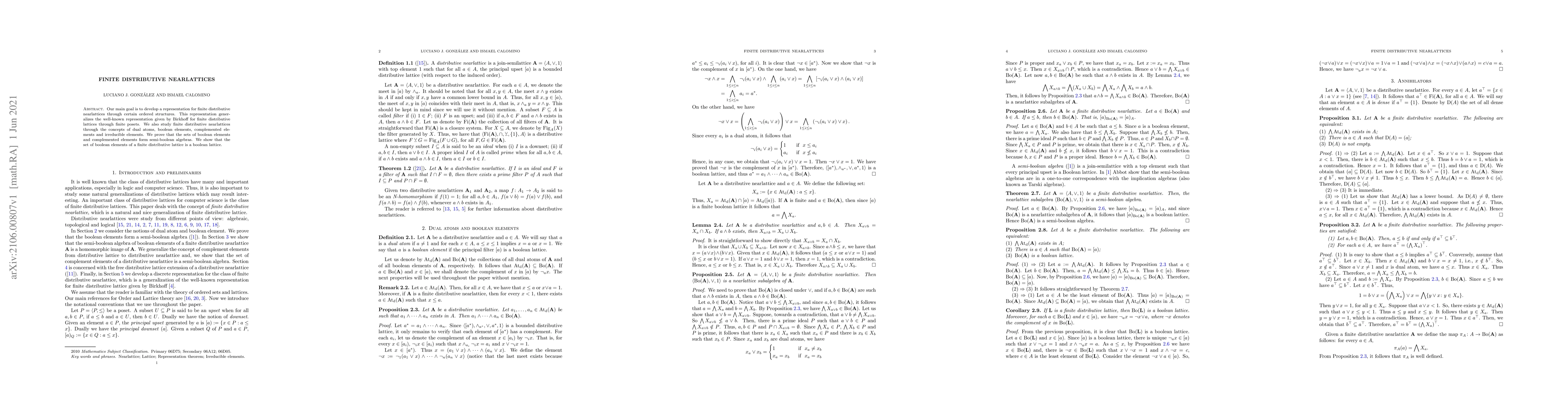 Our main goal is to develop a representation for finite distributive nearlattices through certain ordered structures. This representation generalizes the well-known representation given by Birkhoff for finite distributive lattices through finite posets. We also study finite distributive nearlattices through the concepts of dual atoms, boolean elements, complemented elements and irreducible elements. We prove that the sets of boolean elements and complemented elements form semi-boolean algebras. We show that the set of boolean elements of a finite distributive lattice is a boolean lattice.