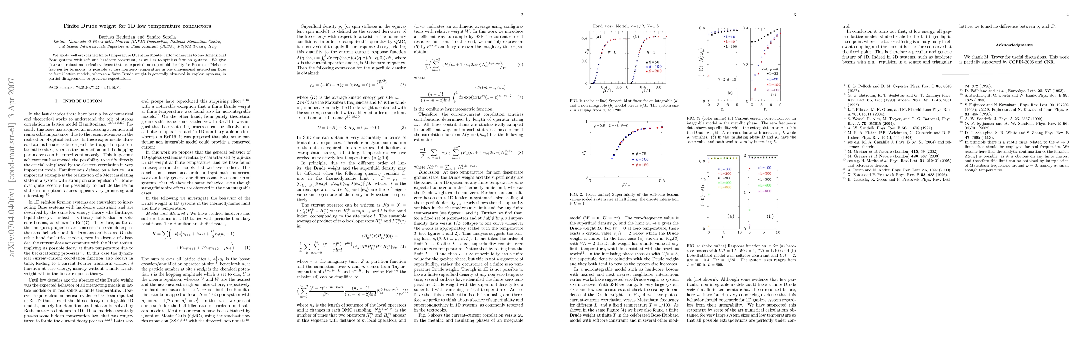 This paper uses Quantum Monte Carlo techniques to demonstrate that 1D interacting Bose and fermion systems exhibit no superfluid density or Meissner fraction at any non-zero temperature, indicating a finite Drude weight in gapless systems, contrary to previous expectations.