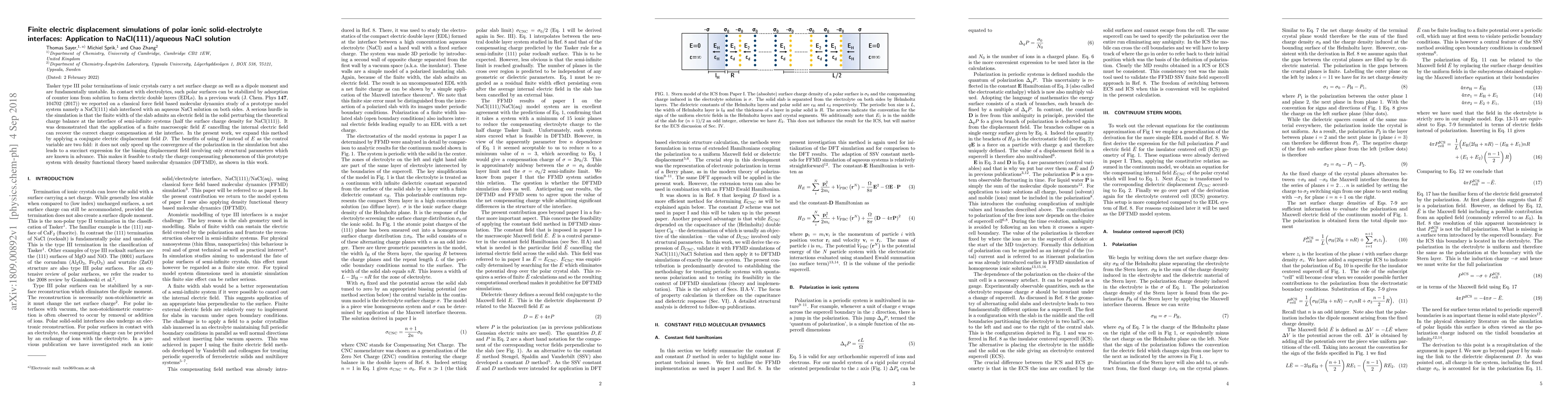 This paper investigates the stabilization of polar ionic solid-electrolyte interfaces using finite electric displacement simulations, focusing on NaCl(111) in contact with aqueous NaCl. It introduces a conjugate electric displacement field $D$ to replace the macroscopic field $E$, improving simulation convergence and enabling the study with density functional theory based molecular dynamics.