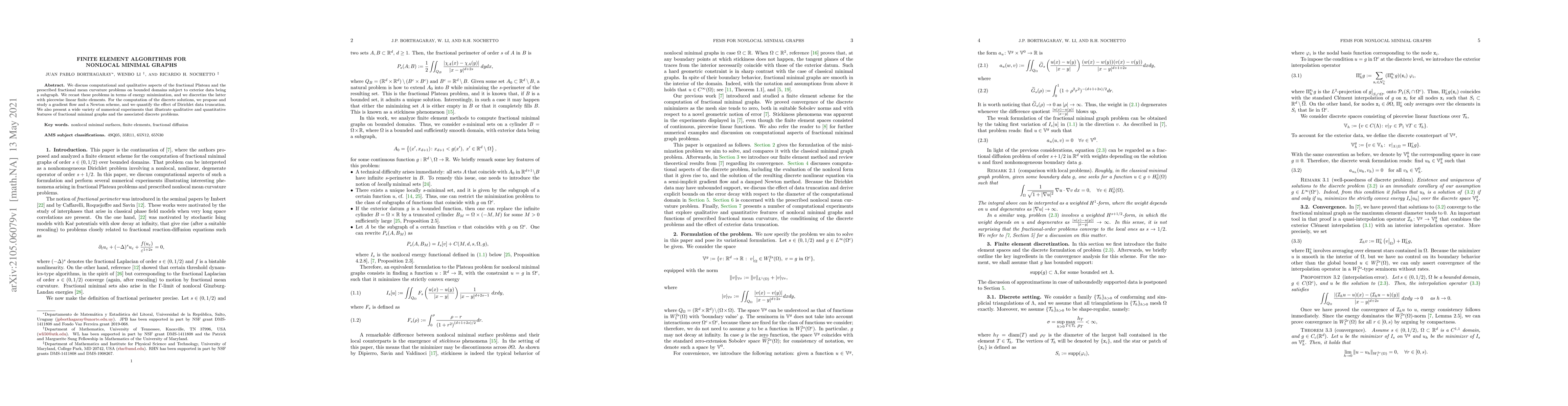 We discuss computational and qualitative aspects of the fractional Plateau and the prescribed fractional mean curvature problems on bounded domains subject to exterior data being a subgraph. We recast these problems in terms of energy minimization, and we discretize the latter with piecewise linear finite elements. For the computation of the discrete solutions, we propose and study a gradient flow and a Newton scheme, and we quantify the effect of Dirichlet data truncation. We also present a wide variety of numerical experiments that illustrate qualitative and quantitative features of fractional minimal graphs and the associated discrete problems.