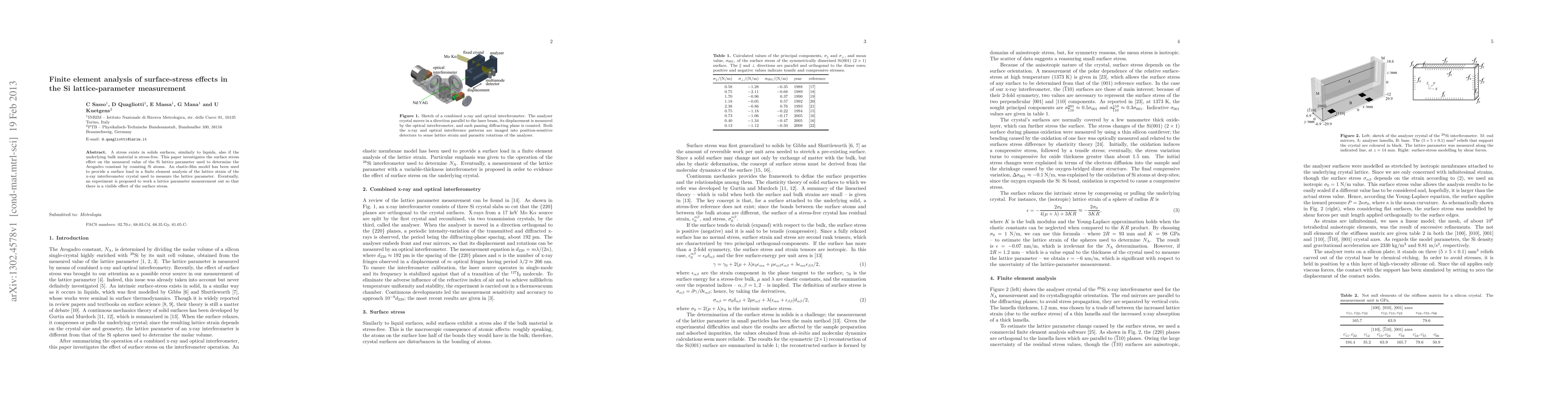 This paper examines how surface stress affects the measurement of the Si lattice parameter, crucial for determining the Avogadro constant. It employs an elastic-film model in finite element analysis to study the lattice strain, proposing an experiment to visibly isolate surface stress effects.