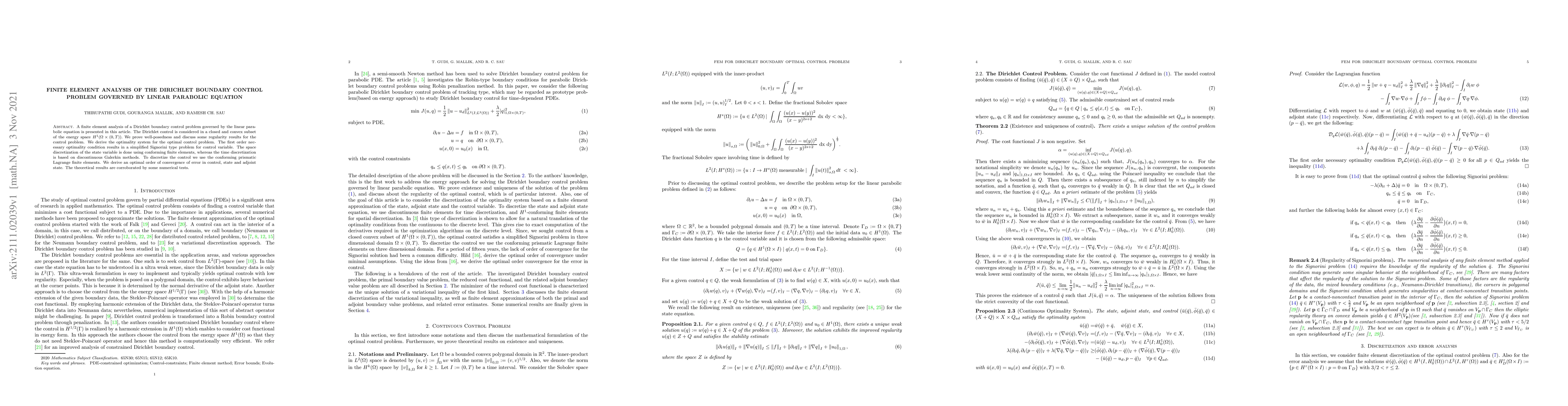 This paper presents a finite element analysis of the Dirichlet boundary control problem governed by a linear parabolic equation, proving well-posedness and deriving an optimality system. The study uses conforming finite elements for space and discontinuous Galerkin methods for time discretization, along with prismatic Lagrange finite elements for control, and corroborates theoretical results with numerical tests.