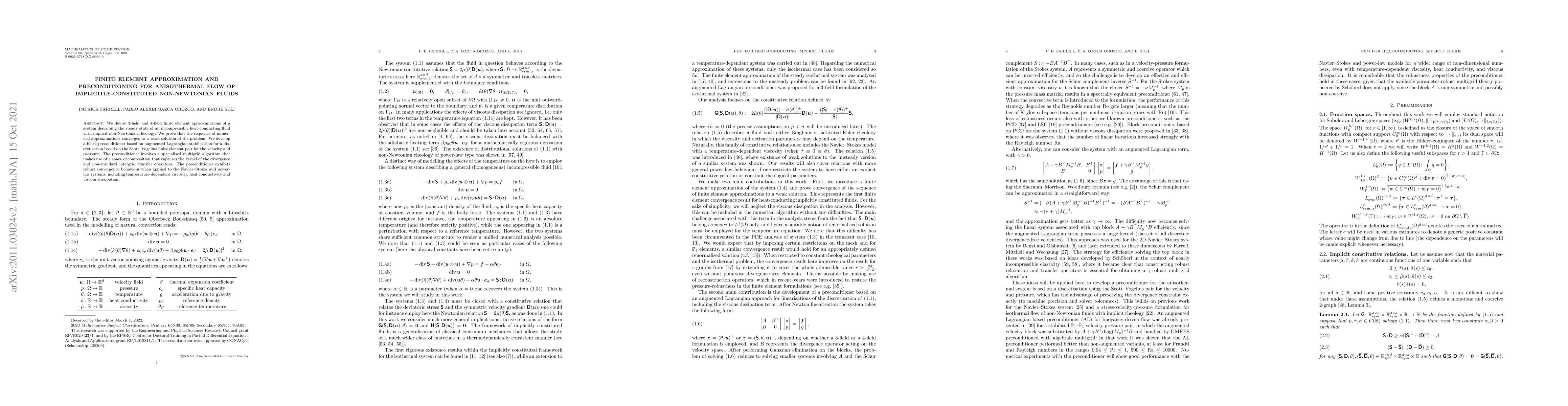 We devise 3-field and 4-field finite element approximations of a system describing the steady state of an incompressible heat-conducting fluid with implicit non-Newtonian rheology. We prove that the sequence of numerical approximations converges to a weak solution of the problem. We develop a block preconditioner based on augmented Lagrangian stabilisation for a discretisation based on the Scott-Vogelius finite element pair for the velocity and pressure. The preconditioner involves a specialised multigrid algorithm that makes use of a space-decomposition that captures the kernel of the divergence and non-standard intergrid transfer operators. The preconditioner exhibits robust convergence behaviour when applied to the Navier-Stokes and power-law systems, including temperature-dependent viscosity, heat conductivity and viscous dissipation.