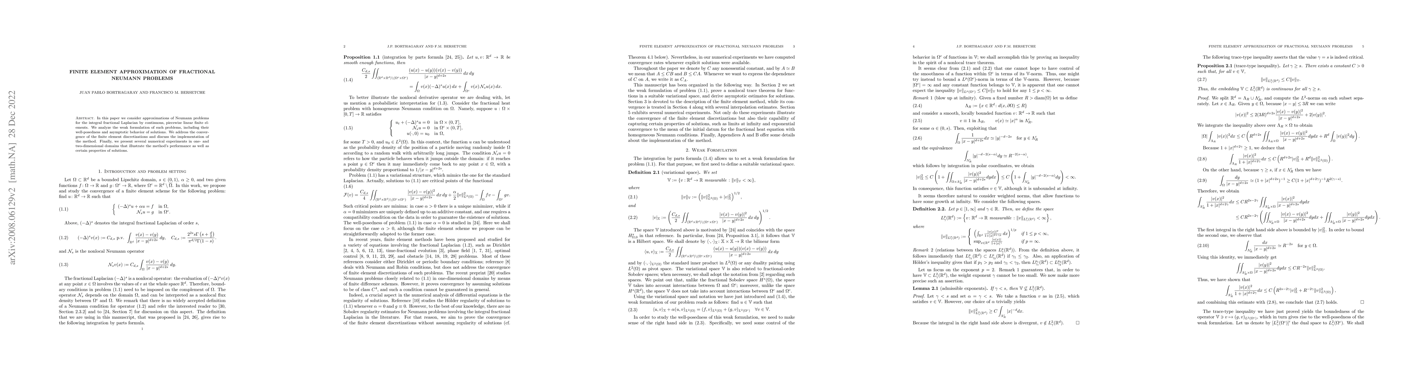 This paper investigates the finite element approximation of fractional Neumann problems using continuous, piecewise linear elements, analyzing the weak formulation, convergence, and implementation. Numerical experiments demonstrate the method's effectiveness in one- and two-dimensional domains.
