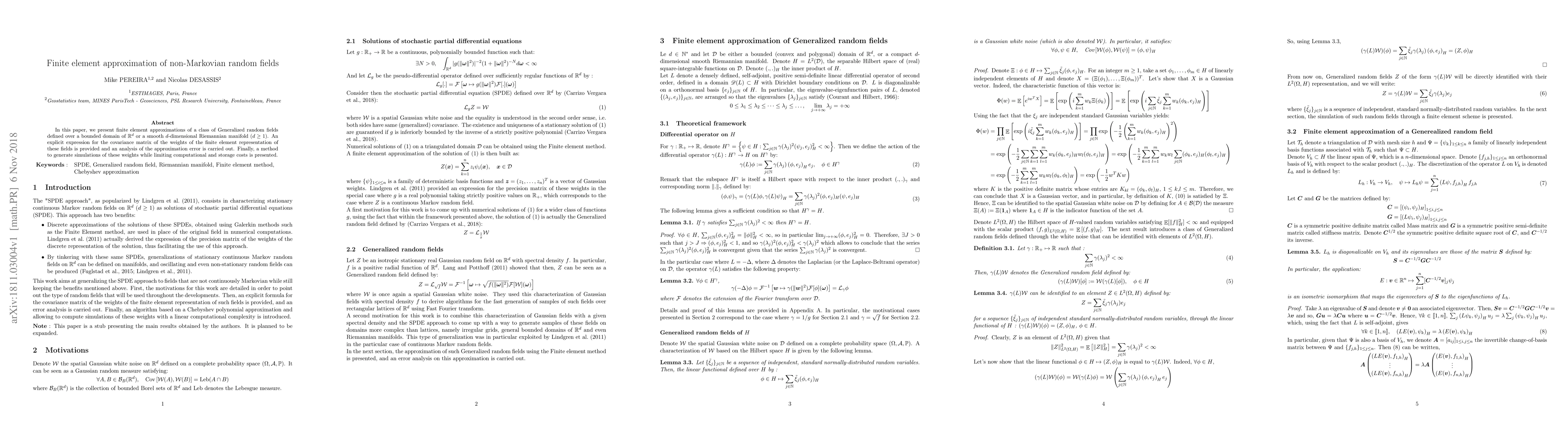 This paper develops finite element approximations for Generalized random fields over bounded domains or smooth Riemannian manifolds, providing an explicit covariance matrix for the weights and analyzing the approximation error. It also introduces a method to simulate these weights efficiently.