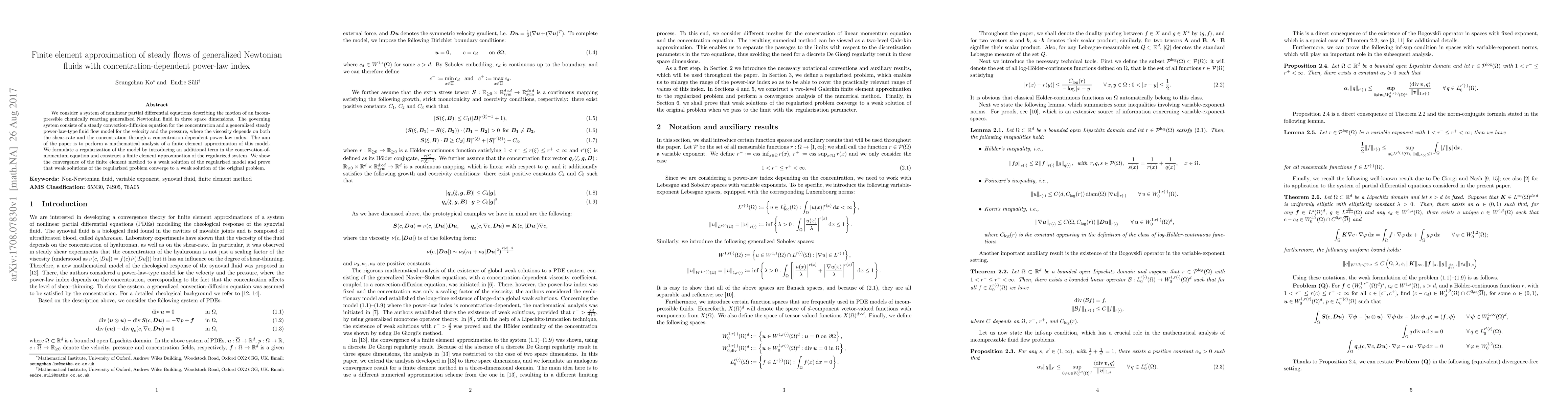 This paper analyzes a finite element approximation for steady flows of generalized Newtonian fluids where viscosity depends on both shear rate and concentration. It introduces a regularization term in the momentum equation and proves the convergence of the finite element method to a weak solution, showing that this solution converges to the original problem's weak solution.