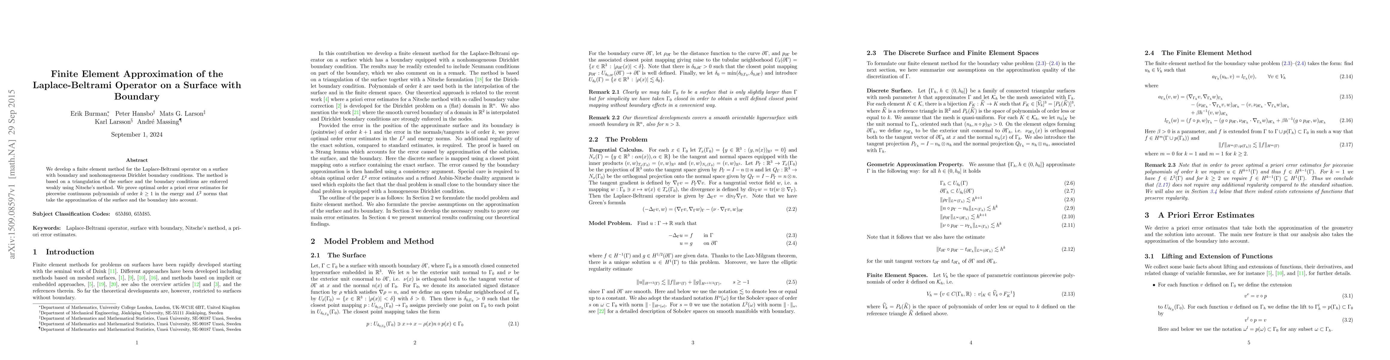 This paper proposes a finite element method for the Laplace-Beltrami operator on surfaces with boundaries, employing Nitsche's method to weakly enforce nonhomogeneous Dirichlet conditions. It provides optimal error estimates for polynomial approximations, considering both surface and boundary approximations.
