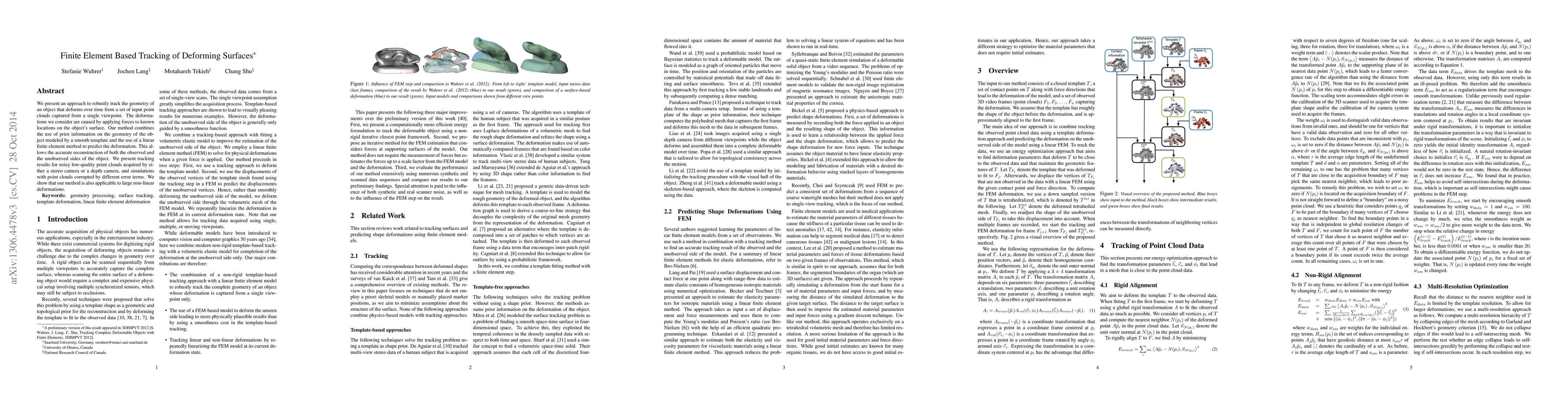 We present an approach to robustly track the geometry of an object that deforms over time from a set of input point clouds captured from a single viewpoint. The deformations we consider are caused by applying forces to known locations on the object's surface. Our method combines the use of prior information on the geometry of the object modeled by a smooth template and the use of a linear finite element method to predict the deformation. This allows the accurate reconstruction of both the observed and the unobserved sides of the object. We present tracking results for noisy low-quality point clouds acquired by either a stereo camera or a depth camera, and simulations with point clouds corrupted by different error terms. We show that our method is also applicable to large non-linear deformations.